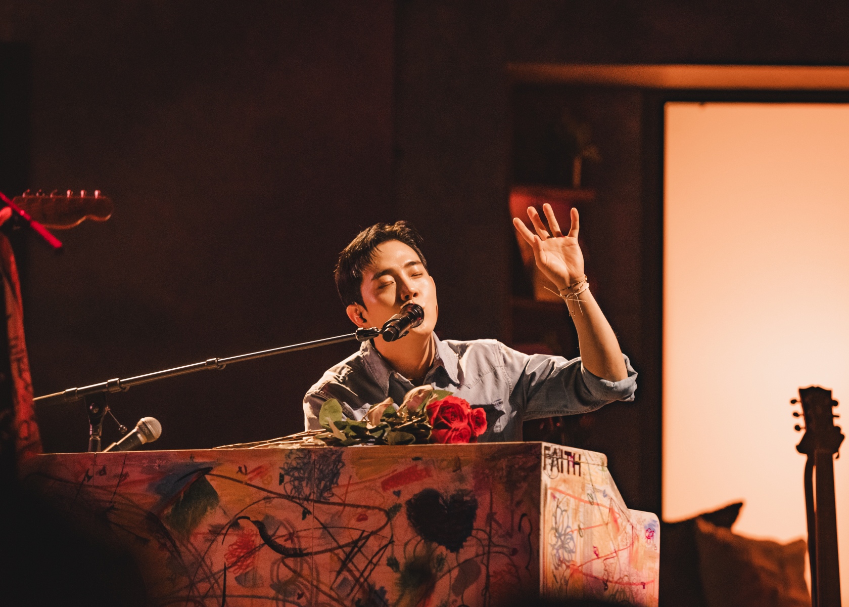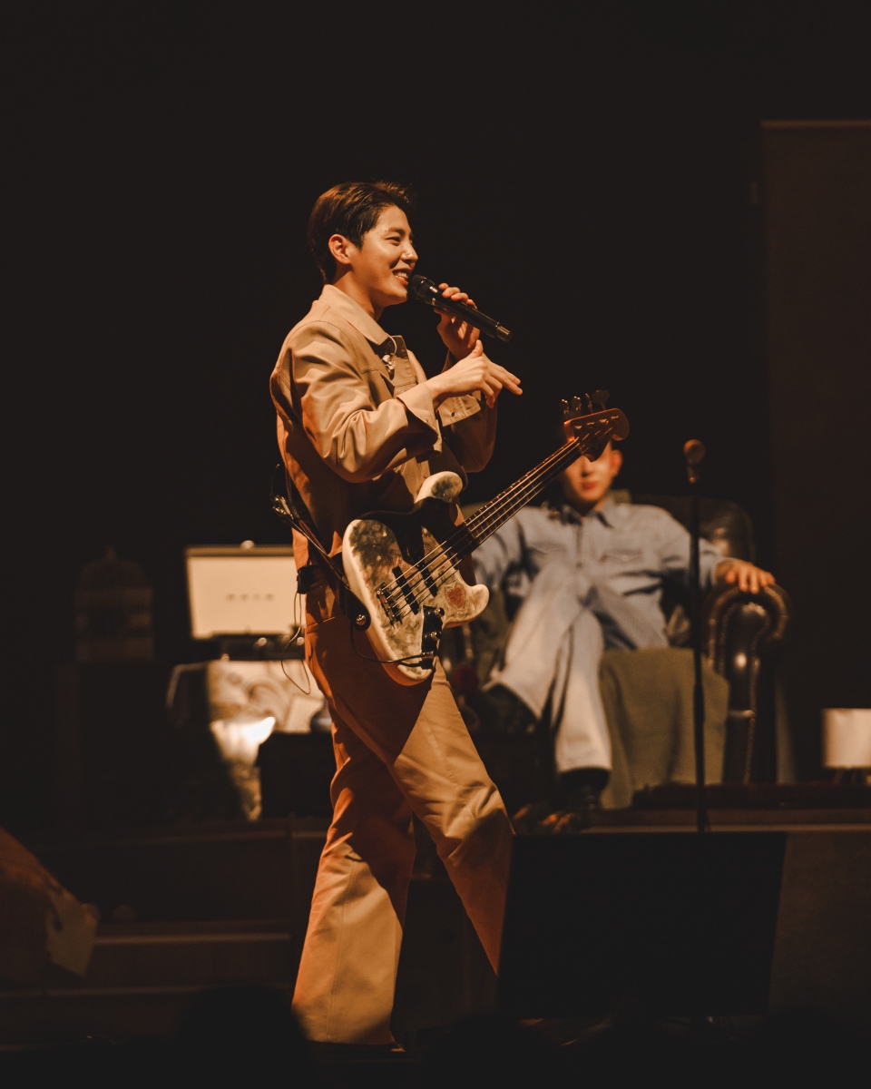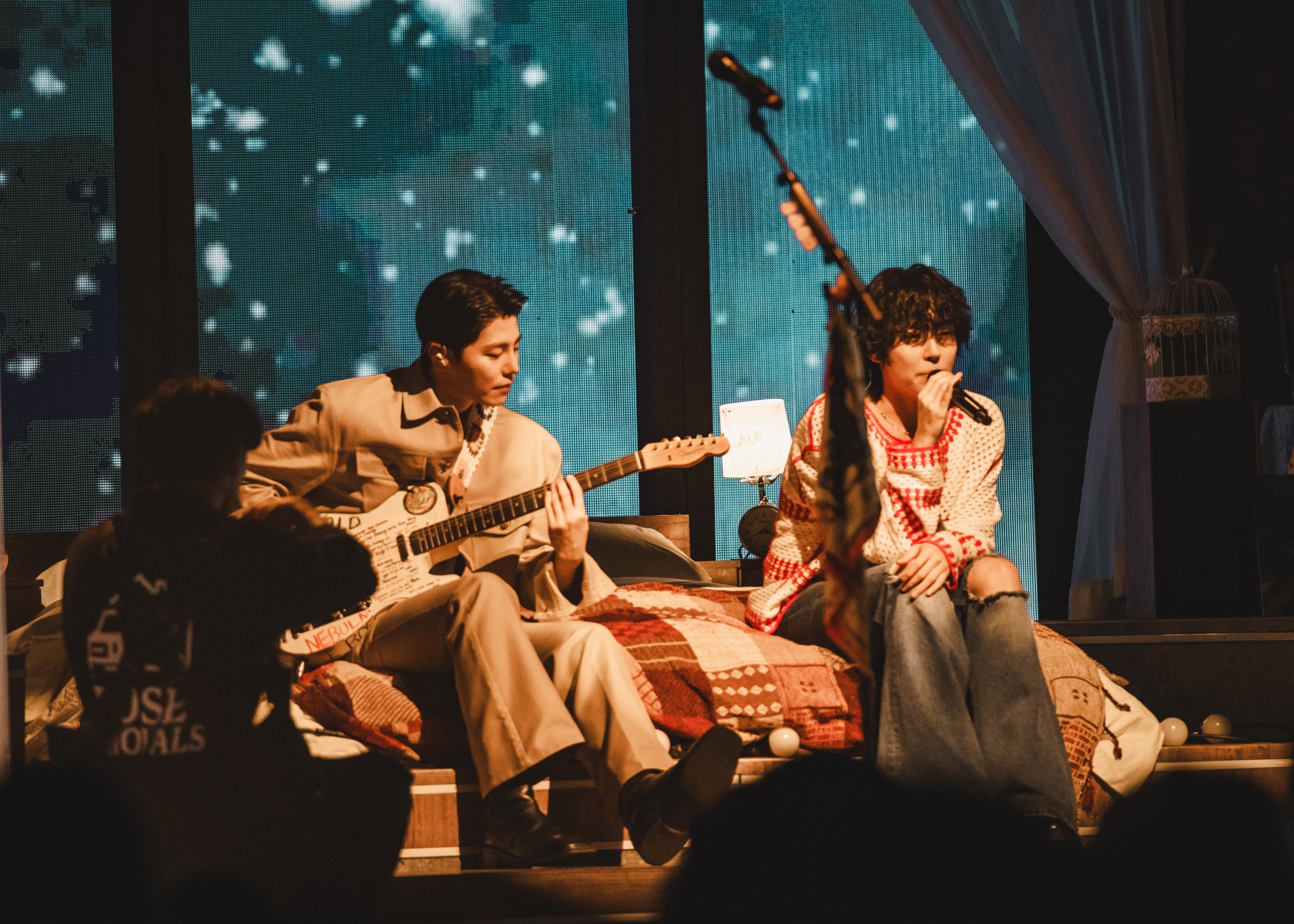 This tour brought their latest album, WRLD, to life in the most charming way possible. They started with acoustic renditions of “숨 (Breath),” “Ticket To The Sky,” and “Childhood” before a stage veil dropped to reveal the coziest set you’ve ever seen. “We brought you guys to our bedroom tonight!” Woosung teased, and he wasn’t wrong — warm lighting, a bed right in the middle, and a sense of home that even included handwritten lyrics etched onto Woosung’s guitar and Dojoon’s piano.