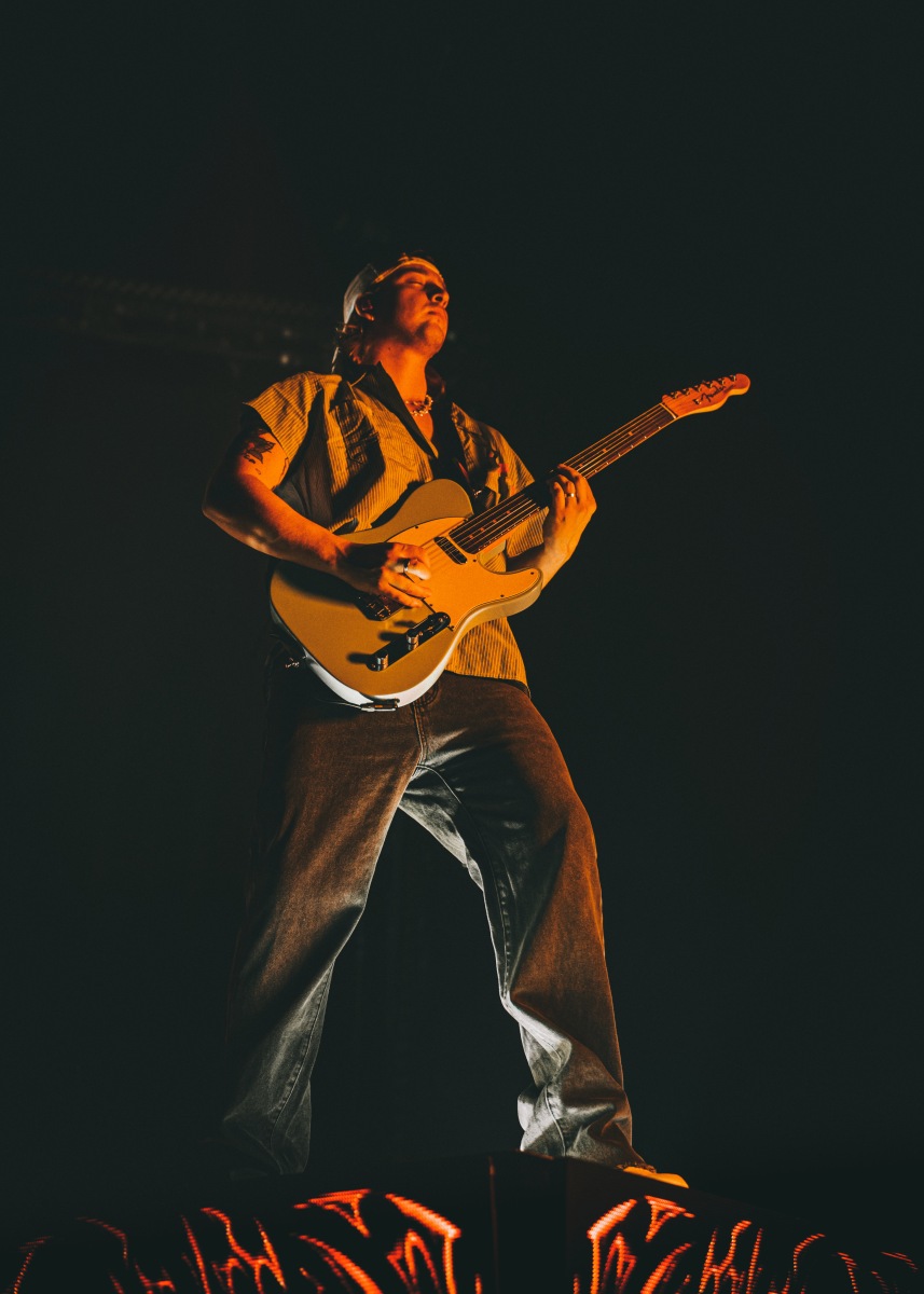 When Chase Atlantic finally took the stage, they did so in grand fashion. A 3-dimensional prism stage adorned with LED visuals cast an intense glow, illuminating the band members against a fiery pit-like backdrop. As the crowd roared, they launched into their latest release, “DIE FOR ME,” which was met with thunderous applause and screams. Lead vocalist Mitchel Cave, affectionately known as MITTY, bounded across the stage, engaging with fans in every corner of the room.