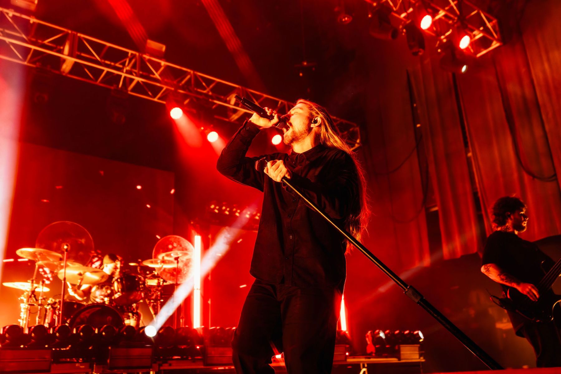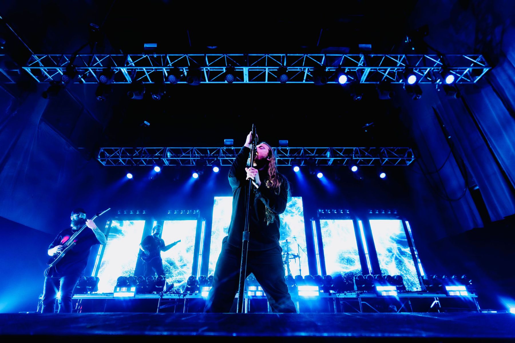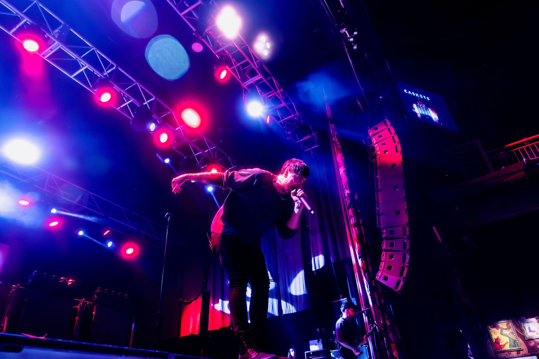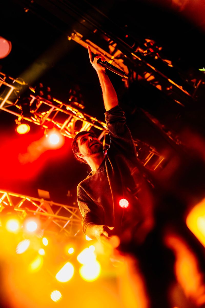 Last up was Currents, the main act of the night, and by this point the crowd was already fully gone…in the best way. A little drunker, a little bolder, people getting pushy, but the second they walked on stage, everyone was on their feet. Instantly. The entire room flipped into one voice, screaming every word back at them. Their sound was just unreal…dark, heavy, and layered in a way that felt almost overwhelming at times, but in the best possible way. It hit hard and stayed there. The lighting and visuals behind them only made it more intense…flashes, shadows, and imagery that made the whole set feel bigger than the room itself. I kept looking back at the crowd and it was the same thing everywhere…people screaming, crowd surfing, losing it, just fully in the moment together. All while a full-on thunderstorm was going off outside. They ran through songs like “Unfamiliar,” “The Death We Seek,” and “Better Days,” packing a solid setlist into their time and not wasting a second of it. It truly was the perfect kind of chaos for a rainy Saturday night…loud, intense, and exactly what everyone there needed.