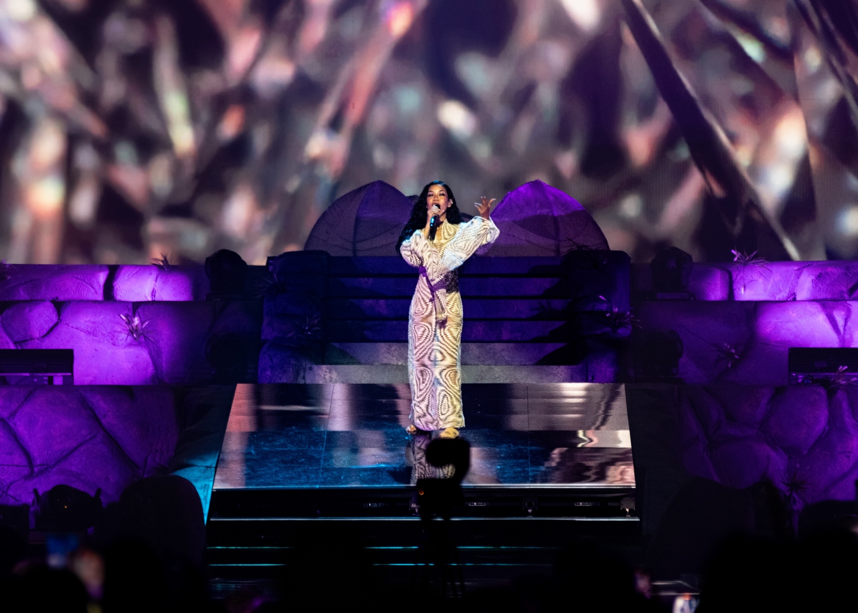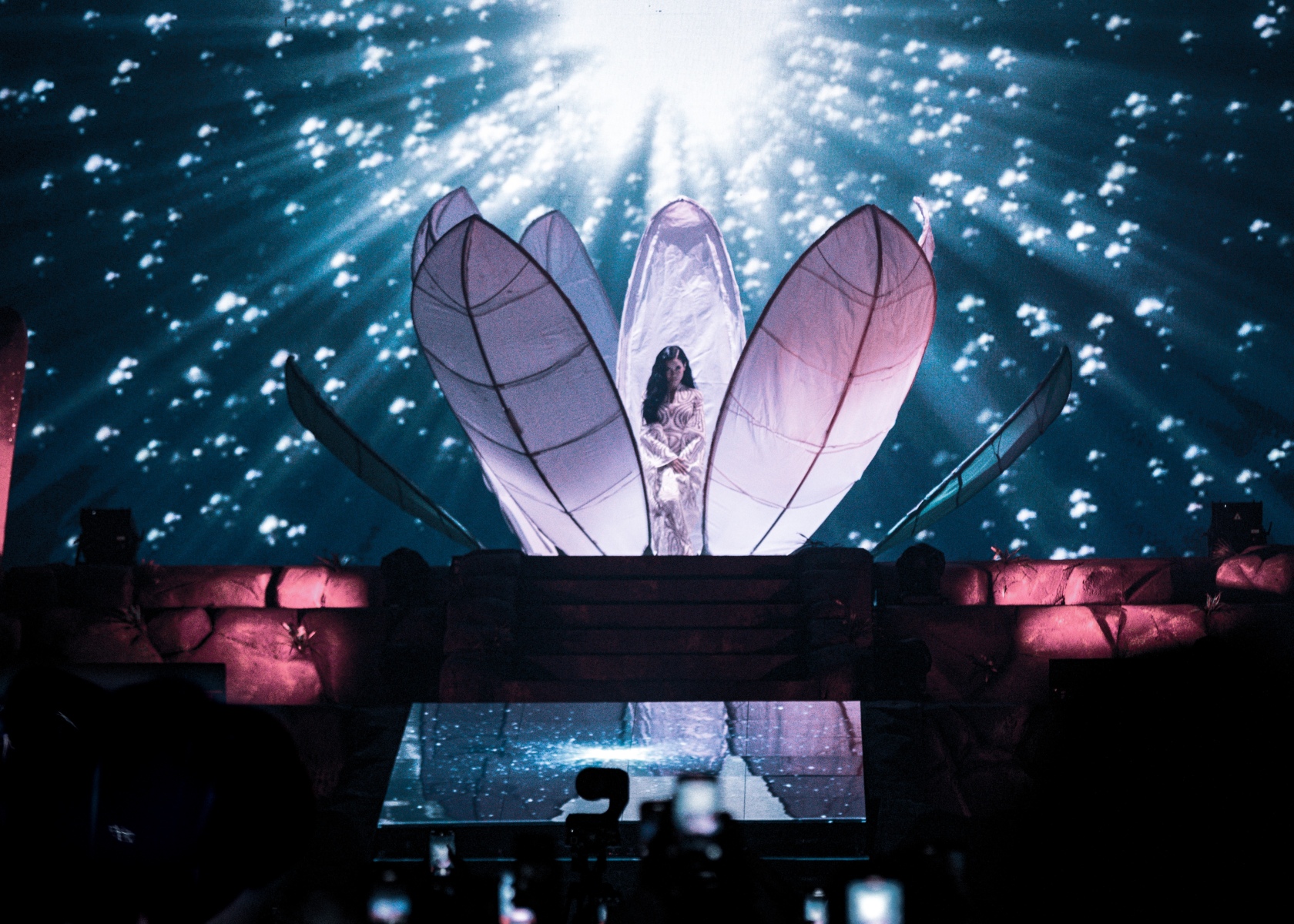 Dressed in a stylish, skin-tight, floor-length dress that perfectly matched her stage setup, Aiko commanded the stage with an effortless grace. The backdrop displayed beautiful violet ice formations, adding to the magical ambiance of the evening.