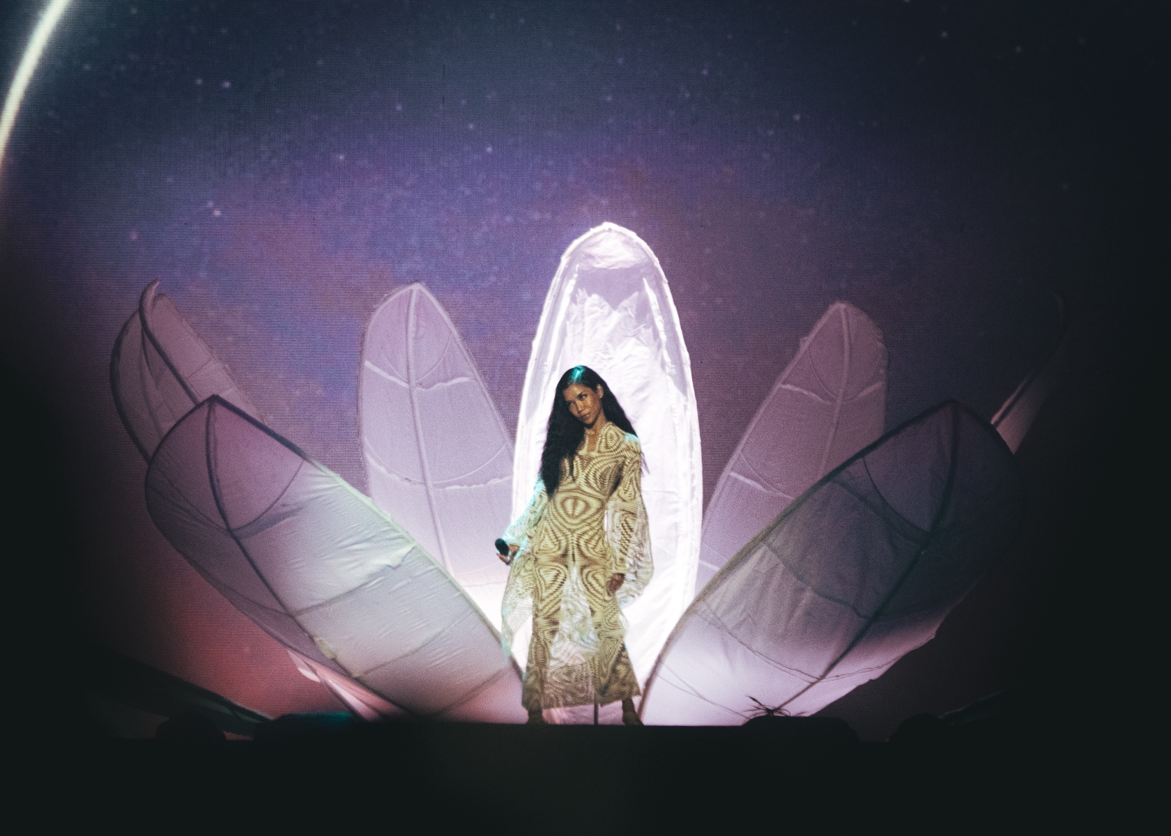 The enchanting R&B singer Jhené Aiko embarked on her “Magic Hour Tour,” encompassing 29 cities, and brought her ethereal presence to a packed Toyota Center in Houston. As the lights dimmed, anticipation filled the air, and Aiko appeared on stage, blooming from a beautiful flower centered in the middle of the stage, instantly captivating the audience.