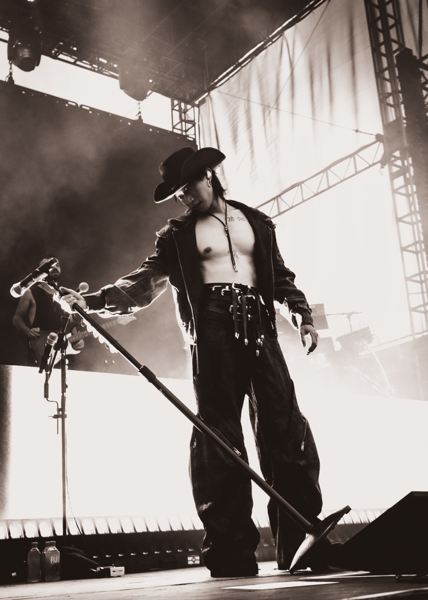 The sun was just beginning to set as fog crept across the stage and the band took their places. The crowd’s screams filled 713 Music Hall, reaching a fever pitch as Keshi stepped into the spotlight. “Houston f–ing Texas!” he roared, kicking off the night with Requiem’s opening track, “Amen.” Dressed in dark denim pants layered with belts, a textured jacket over his bare chest, and a cowboy hat fit for the occasion, Keshi looked every bit the hometown hero.
