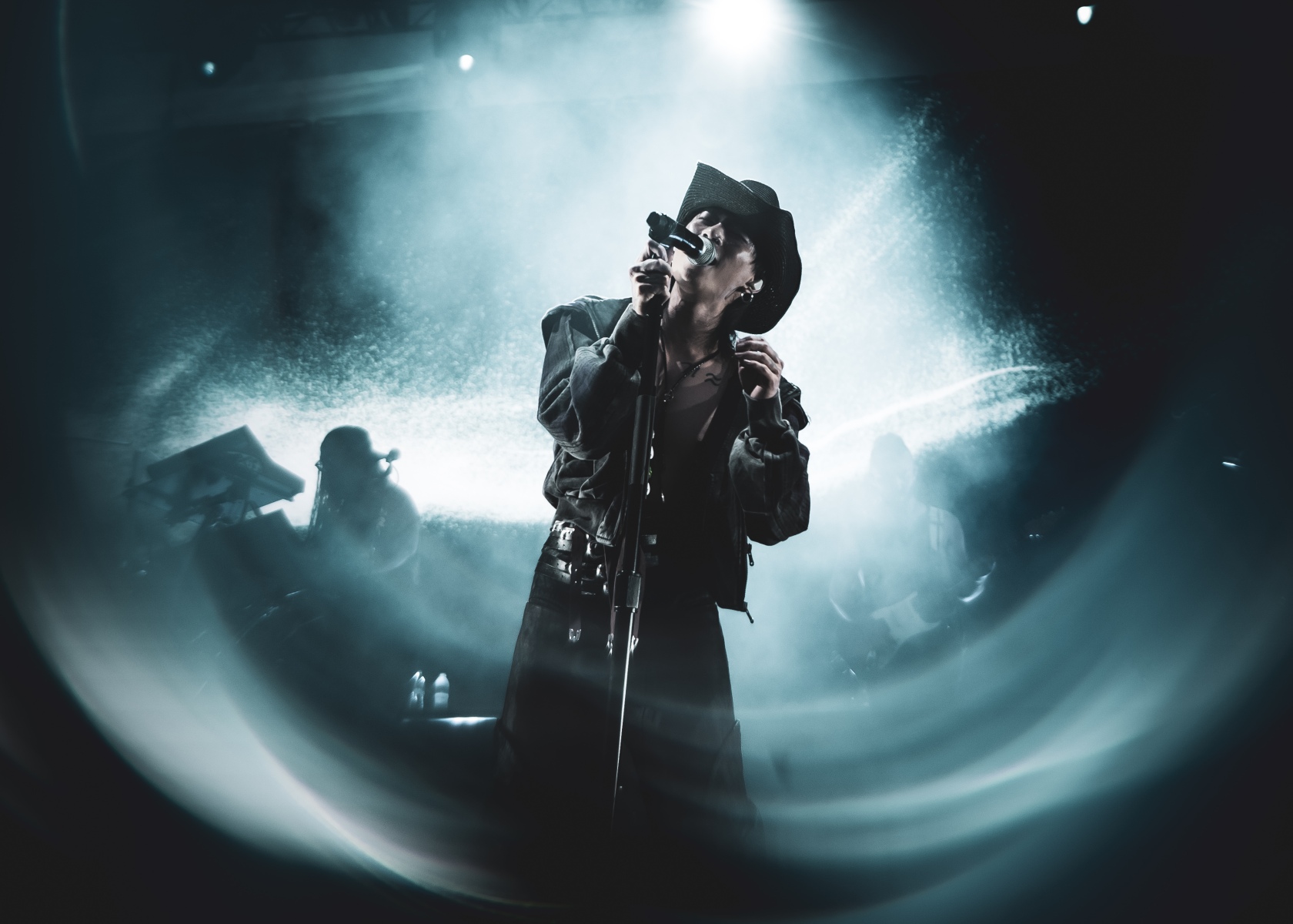 The sun was just beginning to set as fog crept across the stage and the band took their places. The crowd’s screams filled 713 Music Hall, reaching a fever pitch as Keshi stepped into the spotlight. “Houston f–ing Texas!” he roared, kicking off the night with Requiem’s opening track, “Amen.” Dressed in dark denim pants layered with belts, a textured jacket over his bare chest, and a cowboy hat fit for the occasion, Keshi looked every bit the hometown hero.