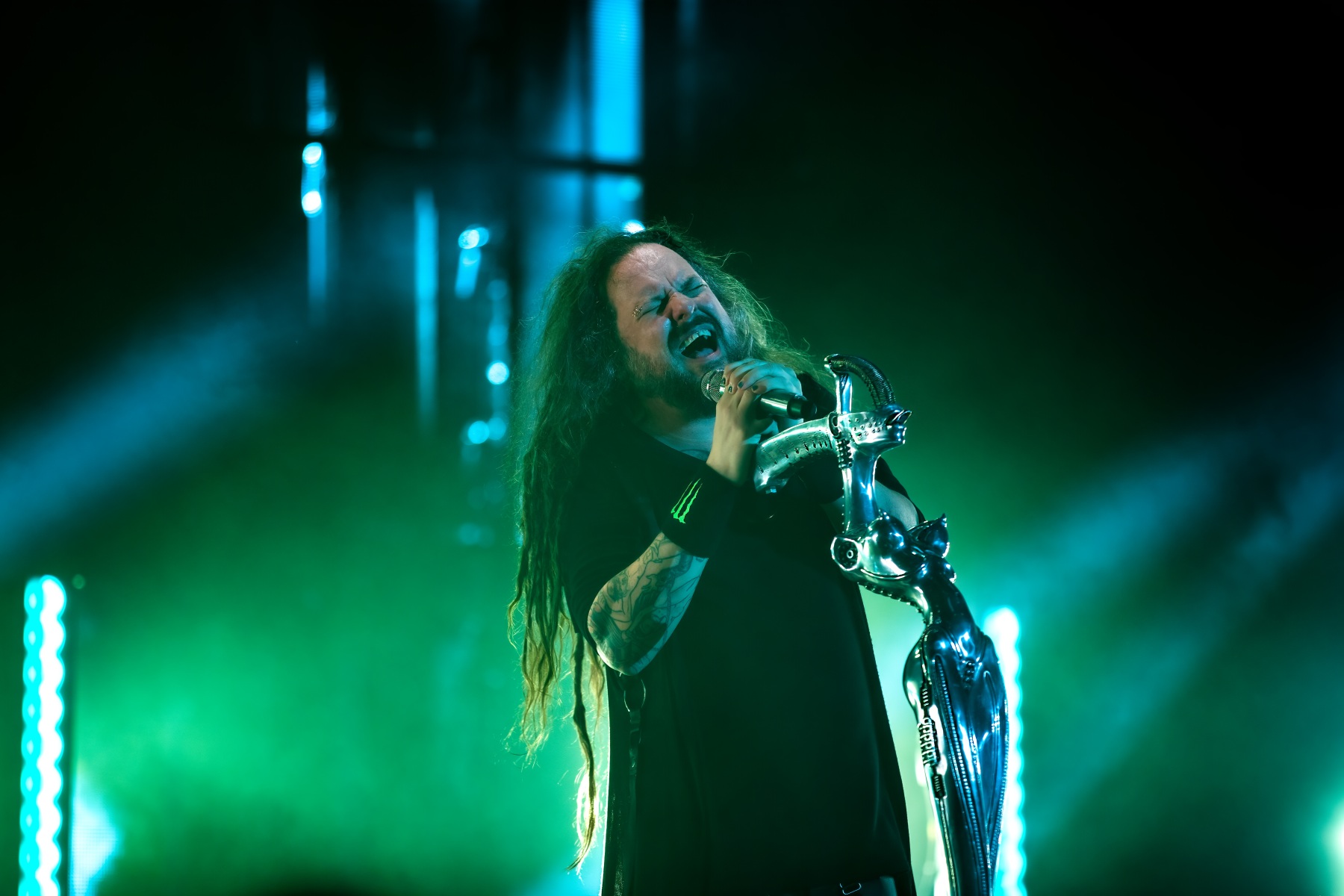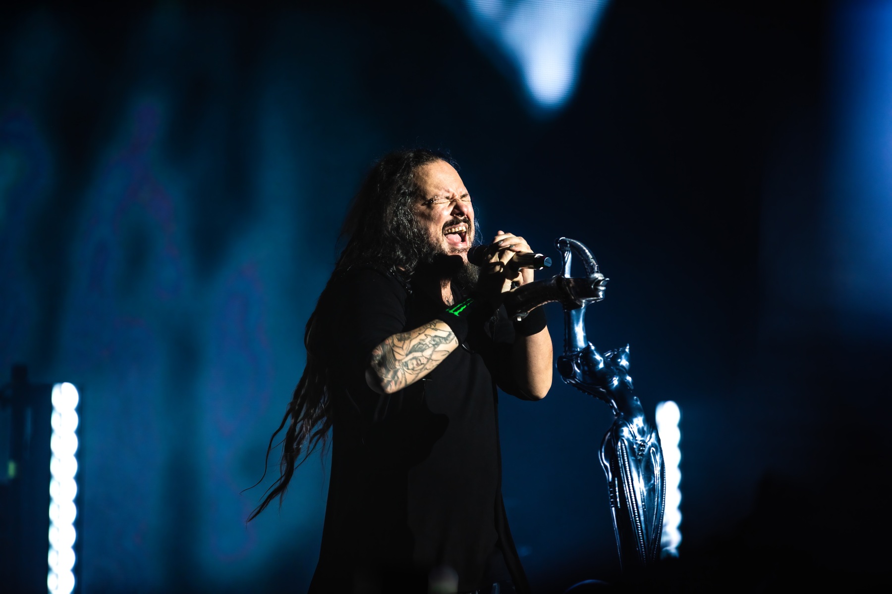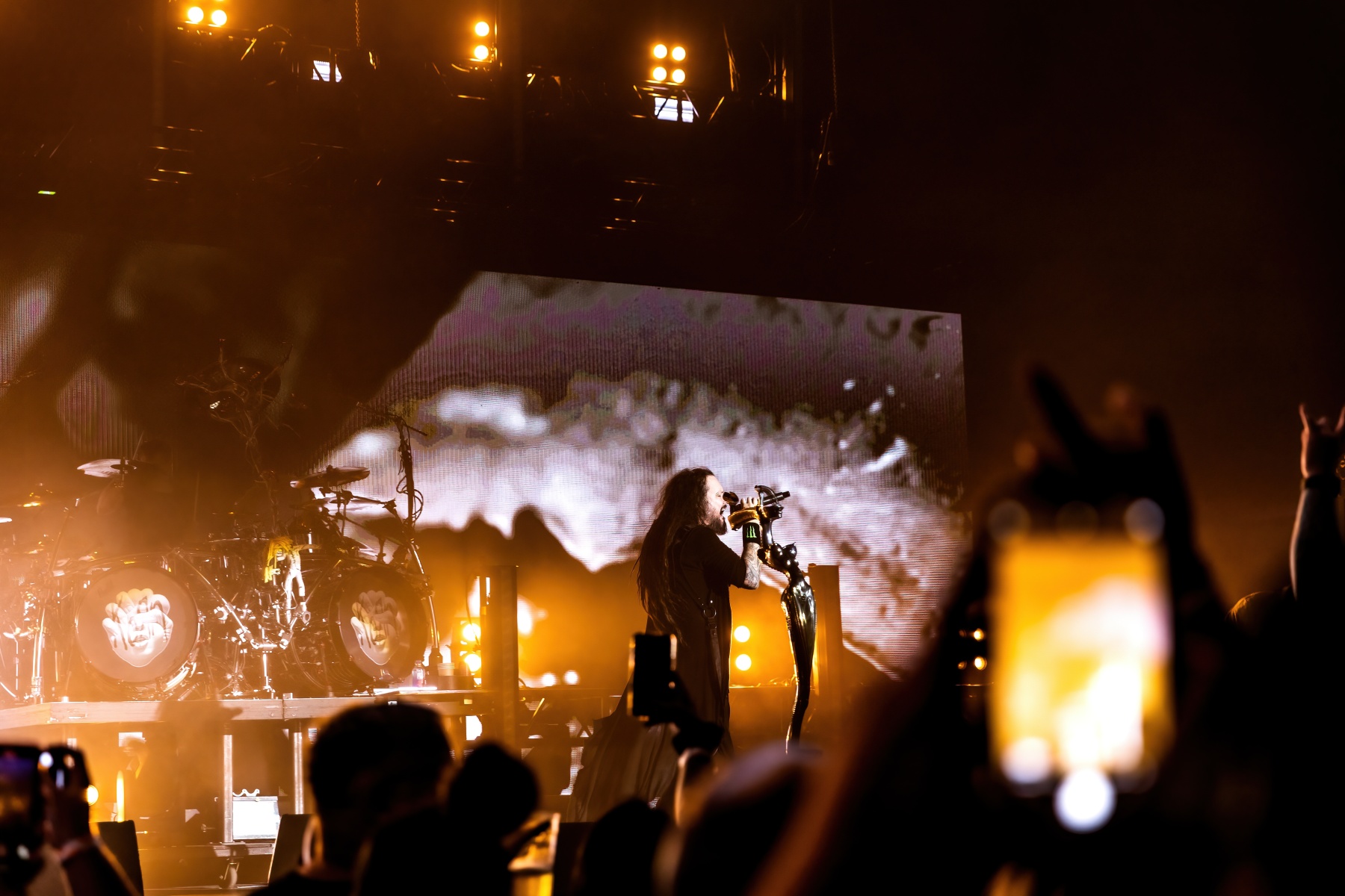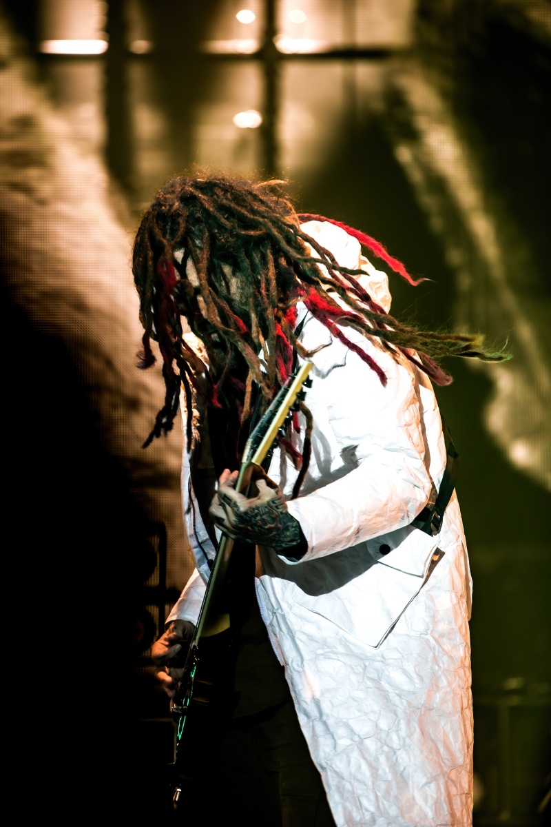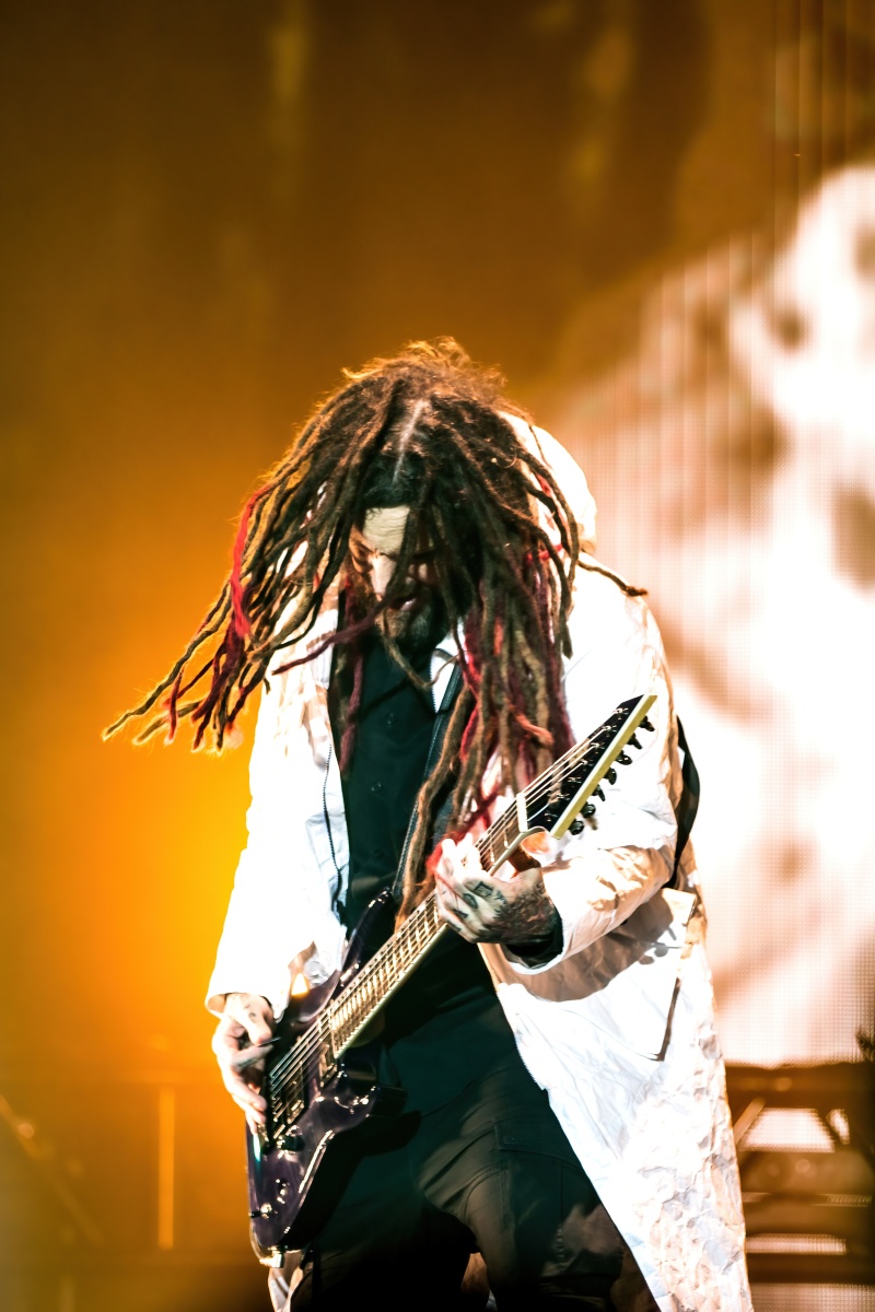 Finally, to end the already badass night, Korn was up and ready to tear your faces off. Starting their set off behind a metal, cage-like screen, “Rotting in Vain” began to blast through everyone’s eardrums and it was really time to rock out. Everyone swarmed together like a pack of bees and instantly started jumping along with the music. Joining Korn on Bass, Ra Diaz was noticeably stoked to be up on stage and without a doubt filled the shoes for the absent Fieldy. After “A.D.I.D.A.S,” The visually active metal cage-screen finally lifted, showcasing the band and its stage, that was the exact moment the crowd went completely wild. Jumps after jumps, moshes after moshes, Korn was alive and bringing out the craziness in us all. Still embracing their nu-metal roots, each song was sharp and intense and really just made you fall back in love with them again. Once you thought the night couldn’t be any more epic, Amy Lee then surprised everyone and came out to join Korn in a legendary jam-sesh to “Freak On A Leash,” making a brilliant end to the show.