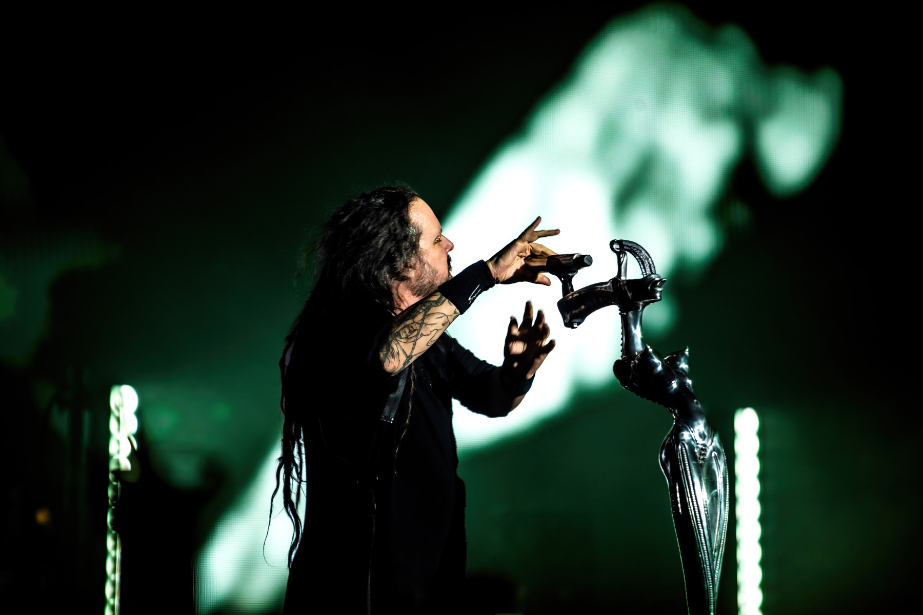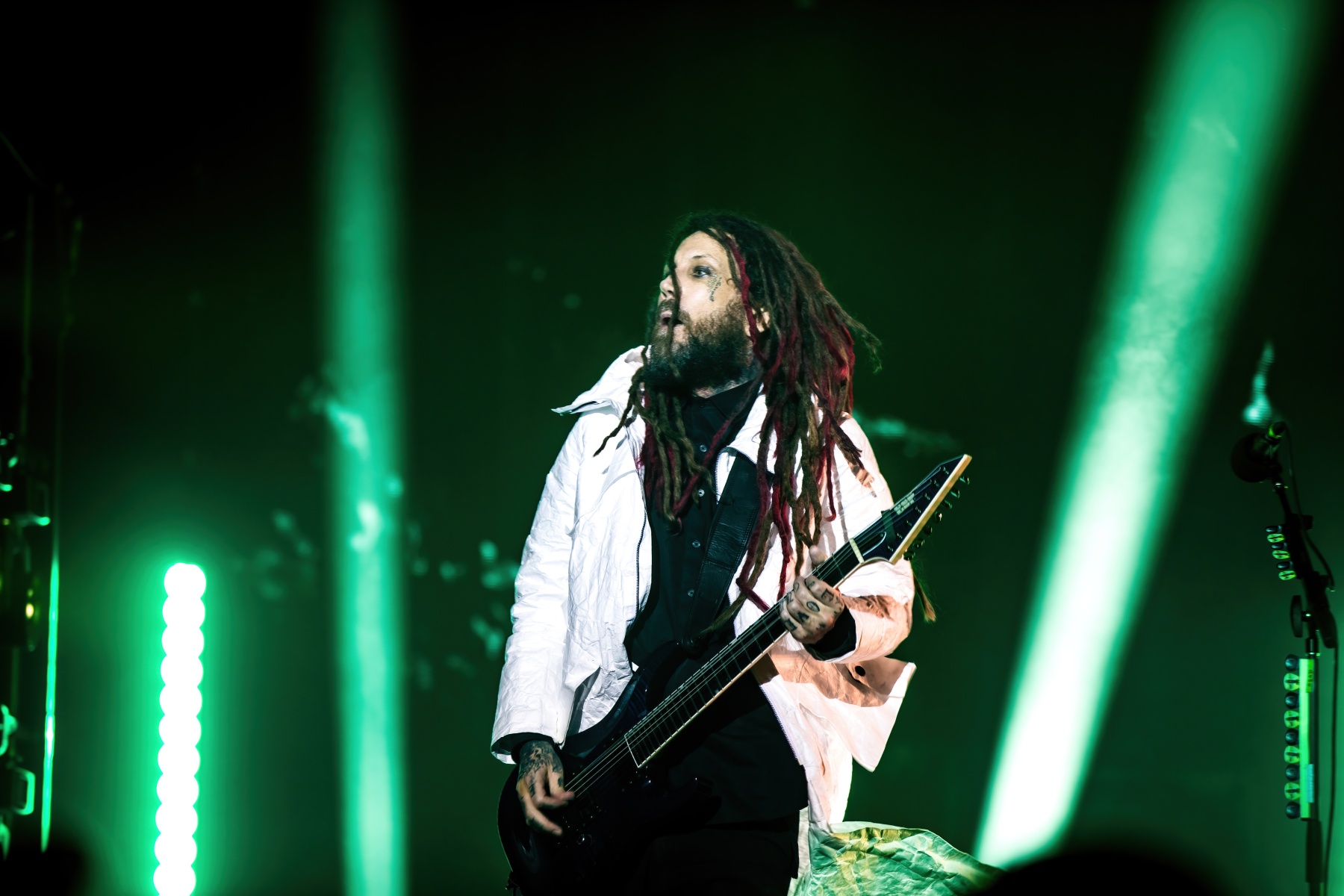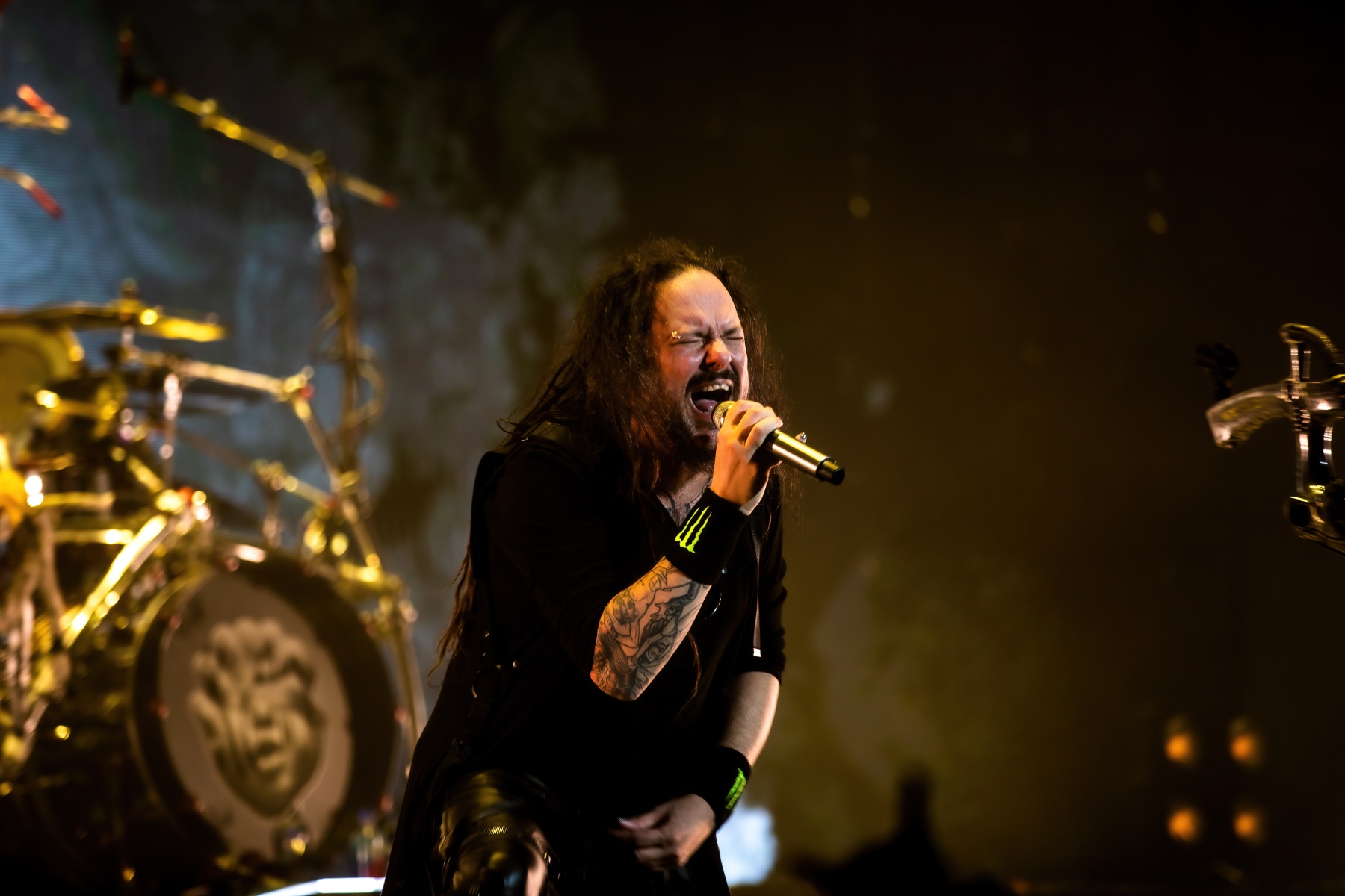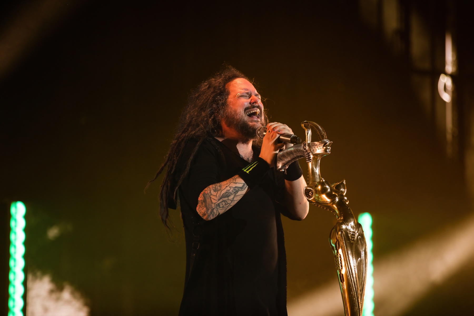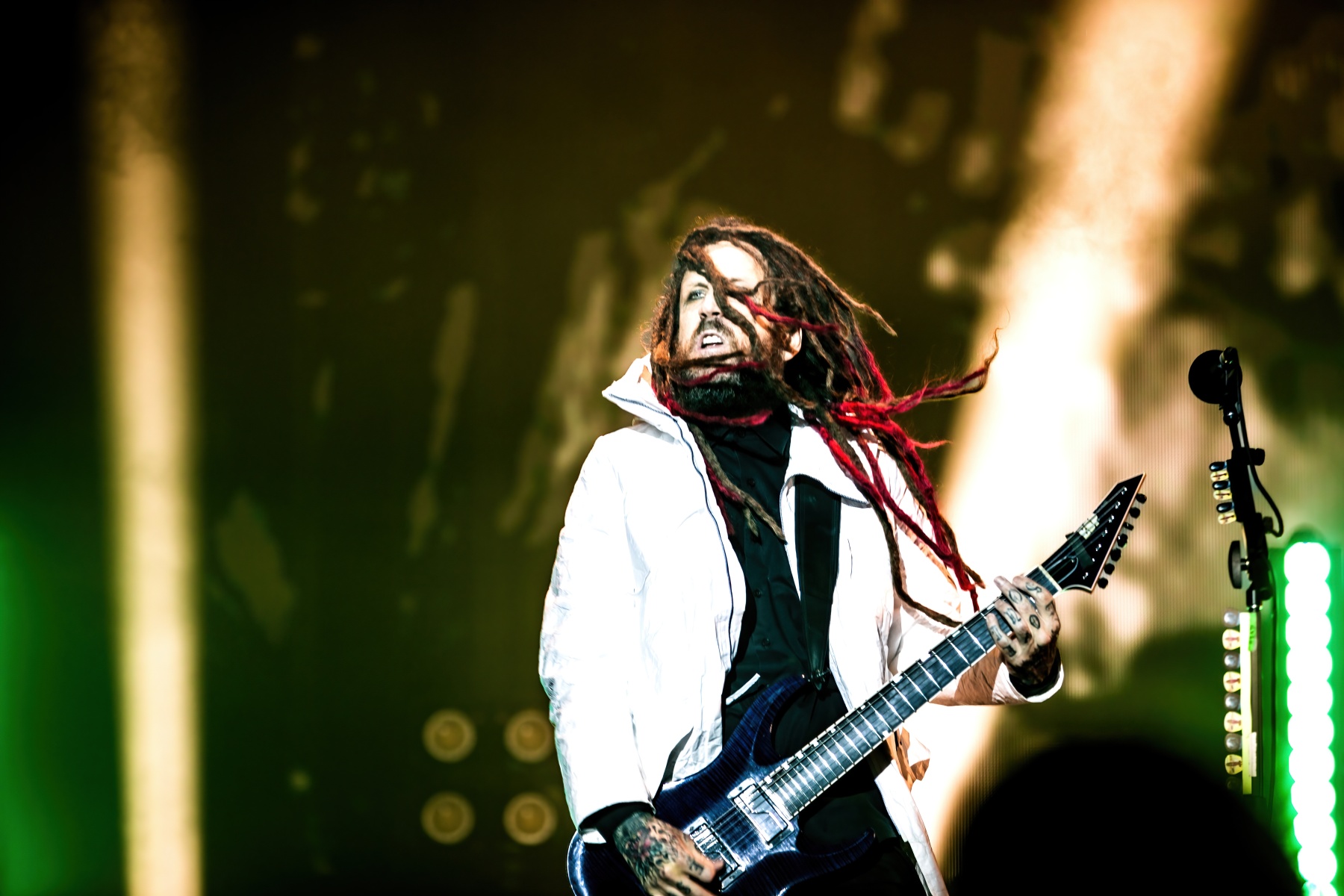 Finally, to end the already badass night, Korn was up and ready to tear your faces off. Starting their set off behind a metal, cage-like screen, “Rotting in Vain” began to blast through everyone’s eardrums and it was really time to rock out. Everyone swarmed together like a pack of bees and instantly started jumping along with the music. Joining Korn on Bass, Ra Diaz was noticeably stoked to be up on stage and without a doubt filled the shoes for the absent Fieldy. After “A.D.I.D.A.S,” The visually active metal cage-screen finally lifted, showcasing the band and its stage, that was the exact moment the crowd went completely wild. Jumps after jumps, moshes after moshes, Korn was alive and bringing out the craziness in us all. Still embracing their nu-metal roots, each song was sharp and intense and really just made you fall back in love with them again. Once you thought the night couldn’t be any more epic, Amy Lee then surprised everyone and came out to join Korn in a legendary jam-sesh to “Freak On A Leash,” making a brilliant end to the show.