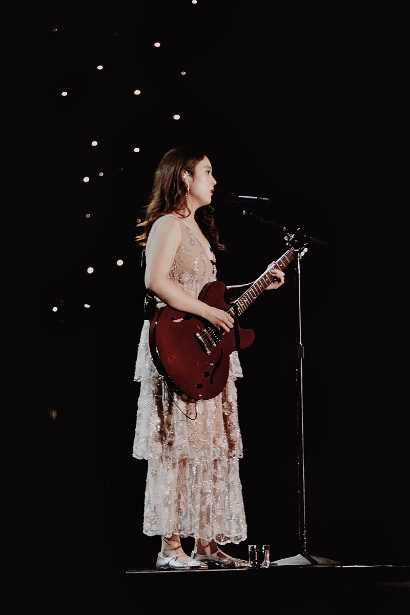 After her first song, she tells us that she snuck into the venue through a car and saw everyone standing in line. She said, ‘It took all of me not to roll down the window and be like ‘Hi!’ but I didn’t want to screw up the line either, so Hi! Here I am!’ She also apologized for the late start, which was caused by audience members getting scammed, so she wanted to make sure they were all able to come in to enjoy the concert. I thought that was incredibly sweet of her to look out for her fans that way; not many artists would go out of their way to help with this type of issue. Laufey then says, ‘This song is for you,’ and begins the intro of ‘Valentine’.