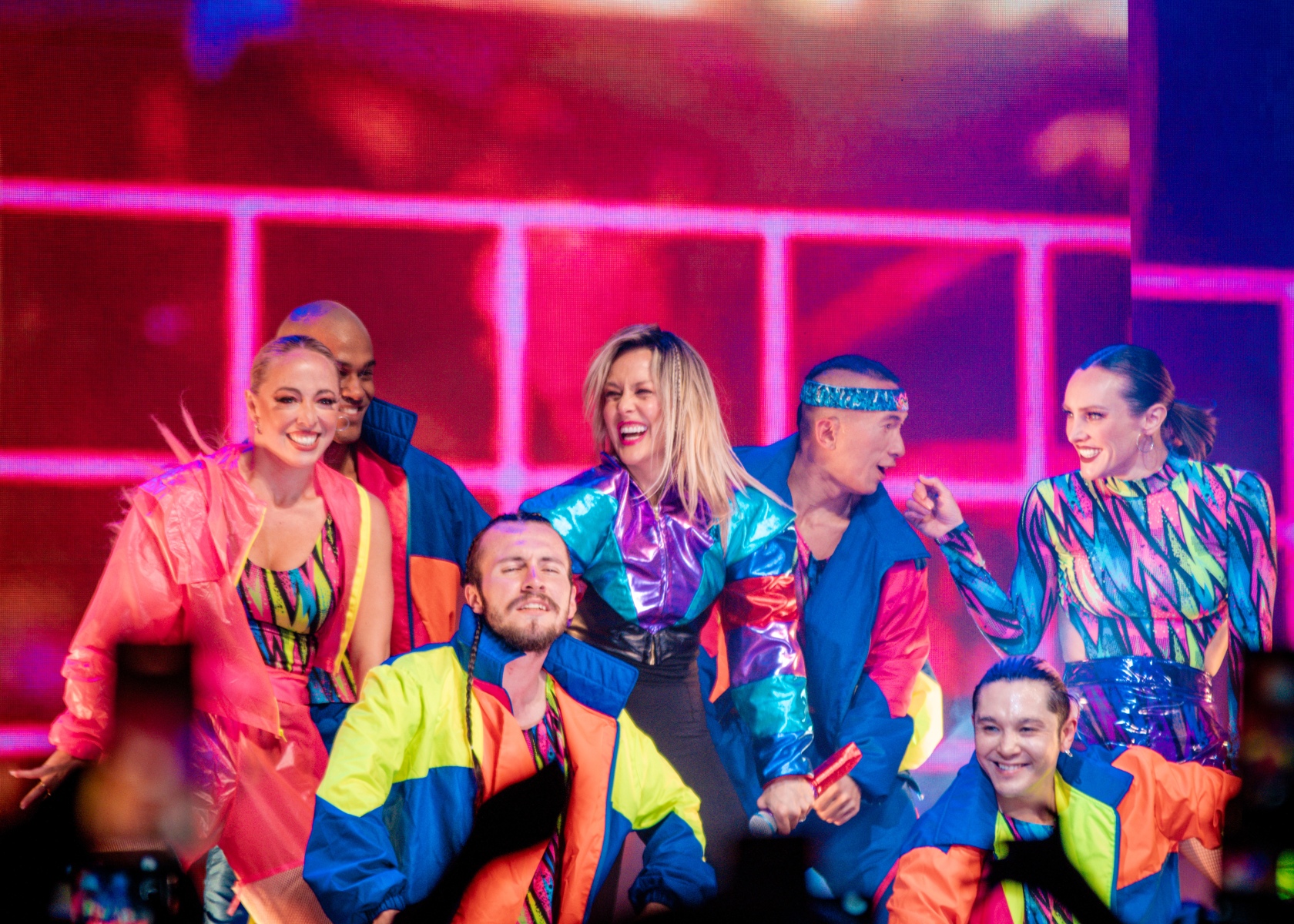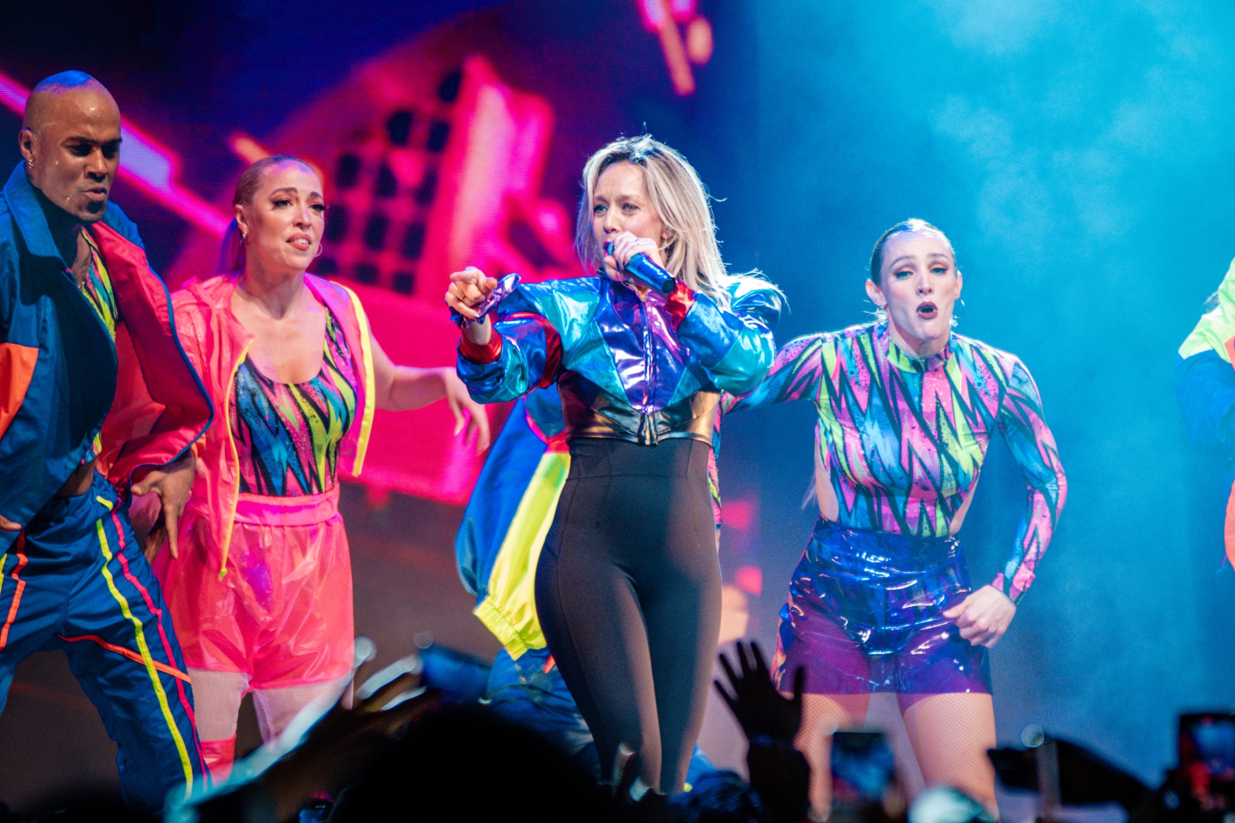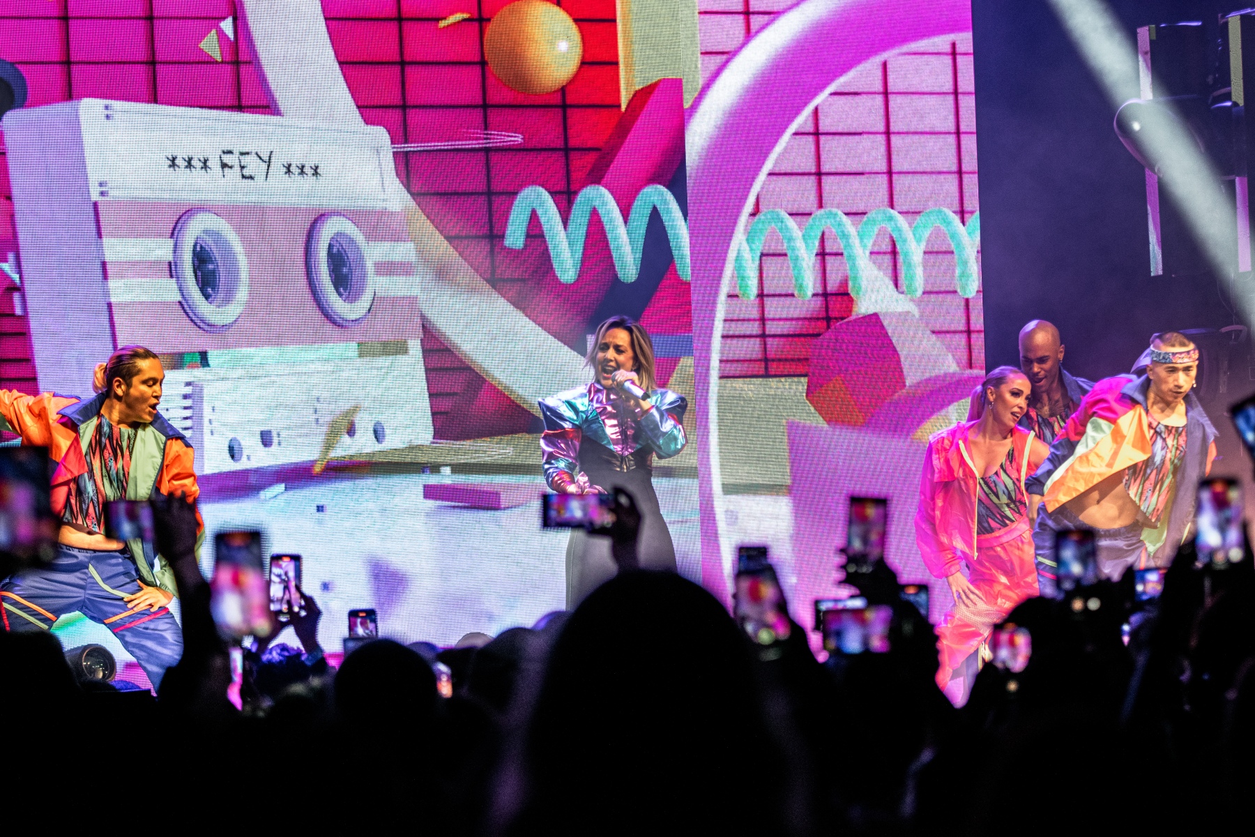 The lights dimmed low and fog started to fill the stage, causing the crowd to chant “Fey! Fey! Fey!” welcoming the pop star and her dancers to the stage. Fey wore a beautiful silver fitted jumpsuit which glistened under the stage lights and a pair of crystal booties that bore the inscription “DO YA THING” in black font. Throughout the show, Fey showcased a variety of different outfits that complemented the themes of her music for each set and evoked nostalgia for her iconic performances in the 90s. She wore a gorgeous black and red gown, a blue and pink metallic jacket with black bottoms, a hot pink jumpsuit, a nude dress with white arrangements resembling the human skeleton, and a tulle dress topped with a black leather jacket. Each outfit brought Fey’s performances to life.