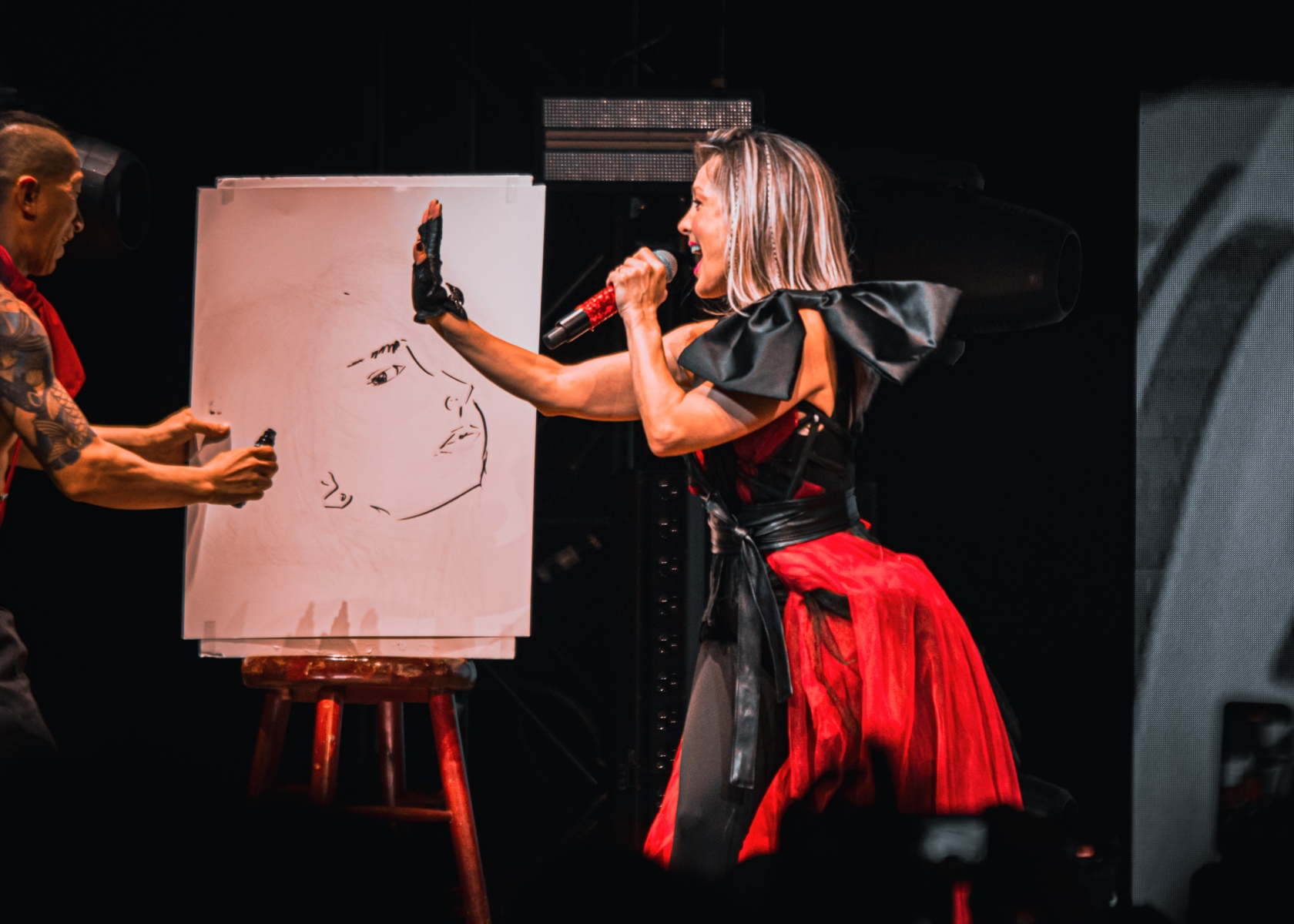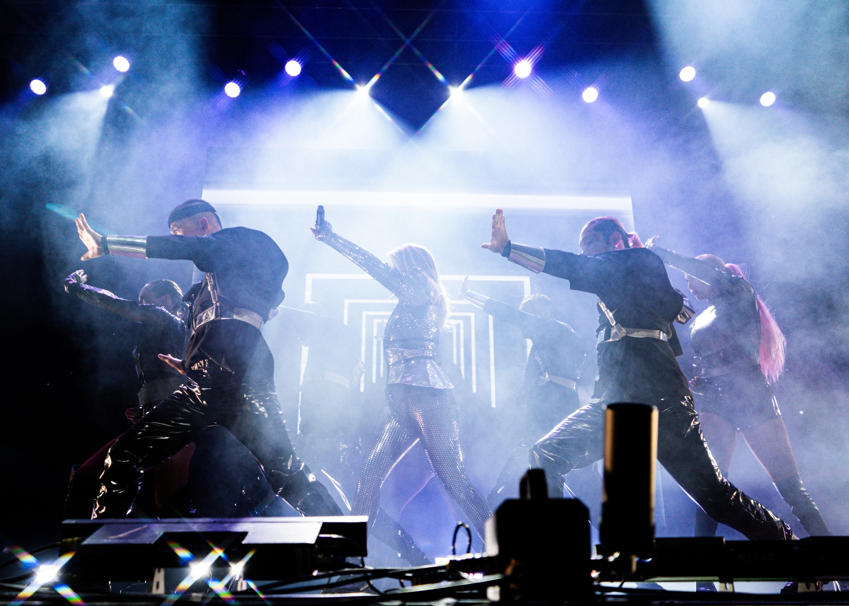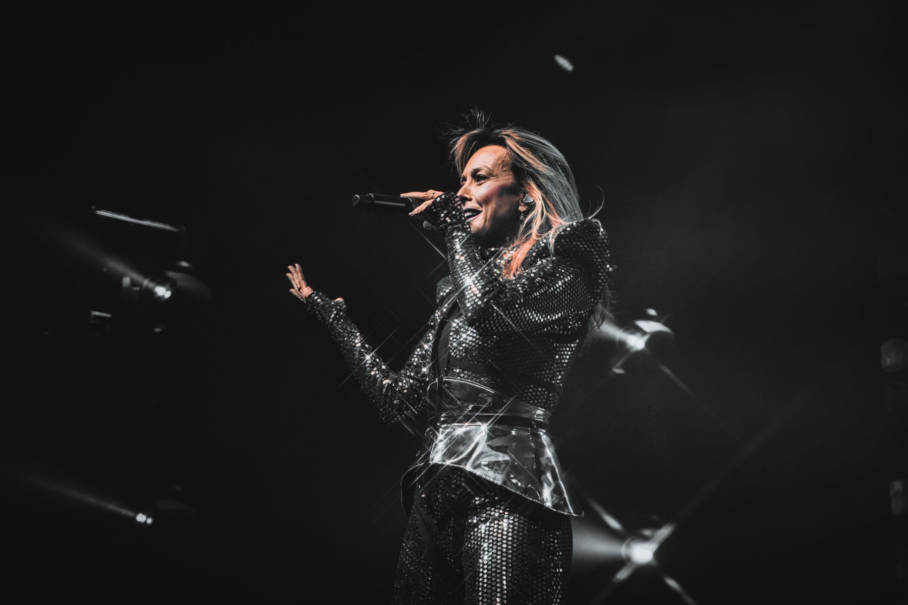 The lights dimmed low and fog started to fill the stage, causing the crowd to chant “Fey! Fey! Fey!” welcoming the pop star and her dancers to the stage. Fey wore a beautiful silver fitted jumpsuit which glistened under the stage lights and a pair of crystal booties that bore the inscription “DO YA THING” in black font. Throughout the show, Fey showcased a variety of different outfits that complemented the themes of her music for each set and evoked nostalgia for her iconic performances in the 90s. She wore a gorgeous black and red gown, a blue and pink metallic jacket with black bottoms, a hot pink jumpsuit, a nude dress with white arrangements resembling the human skeleton, and a tulle dress topped with a black leather jacket. Each outfit brought Fey’s performances to life.