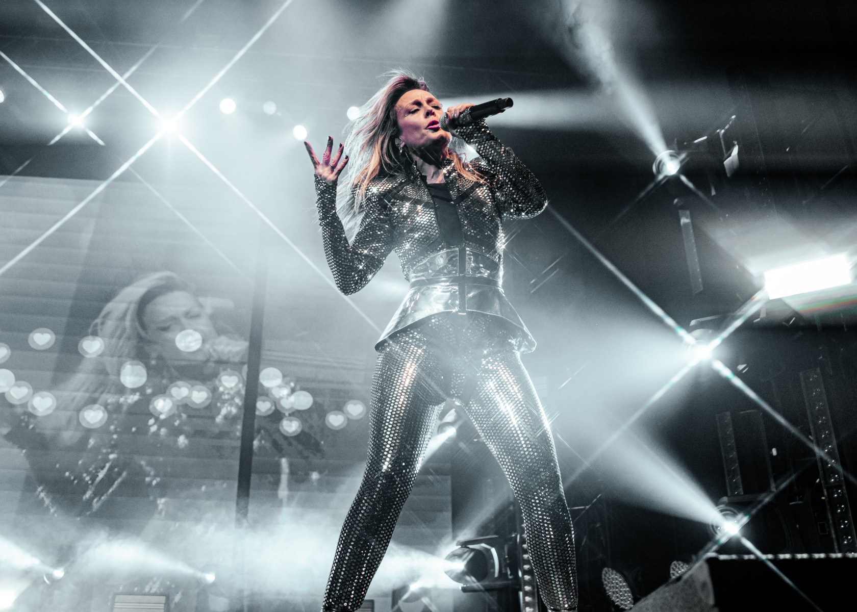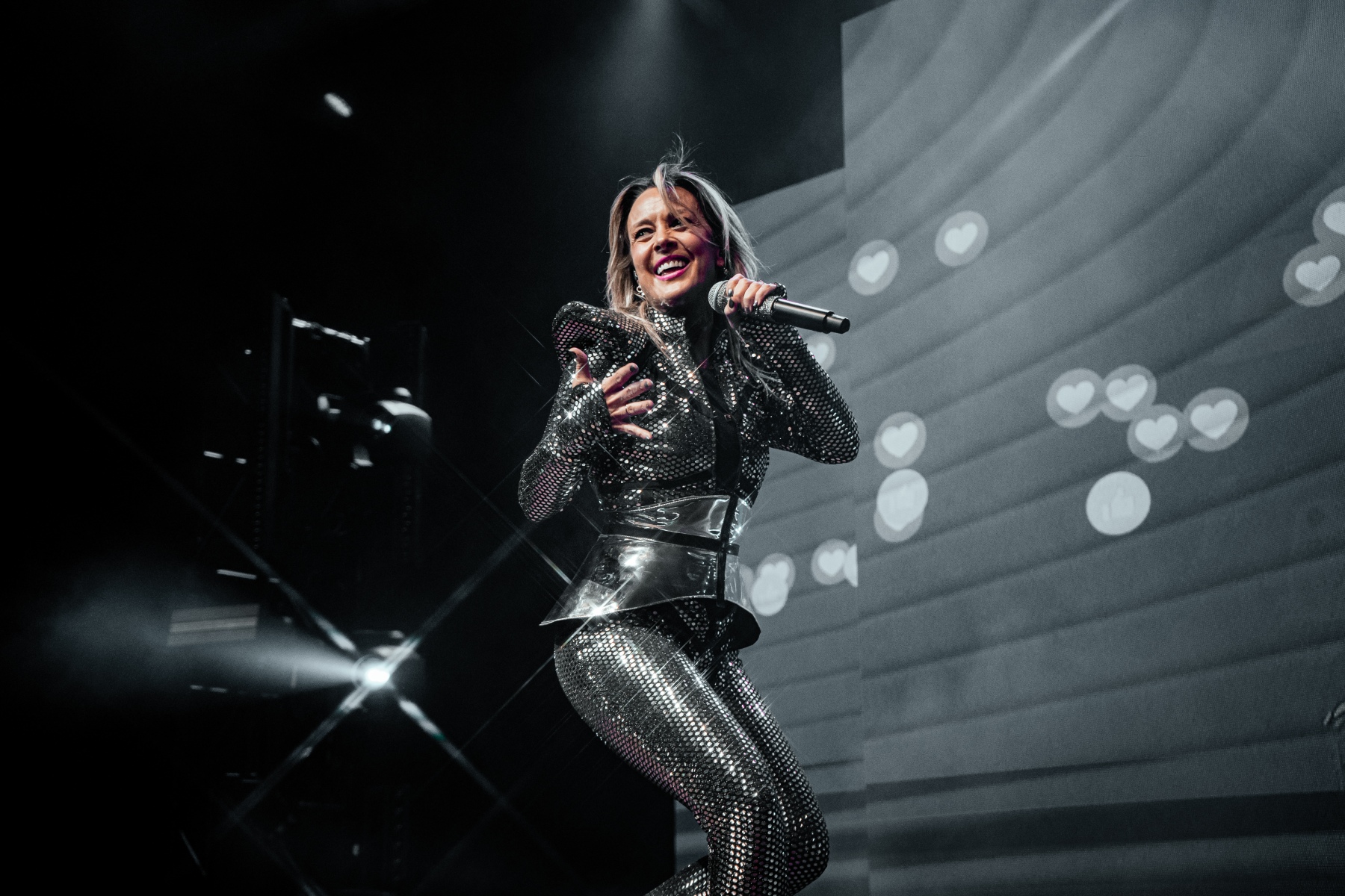 The lights dimmed low and fog started to fill the stage, causing the crowd to chant “Fey! Fey! Fey!” welcoming the pop star and her dancers to the stage. Fey wore a beautiful silver fitted jumpsuit which glistened under the stage lights and a pair of crystal booties that bore the inscription “DO YA THING” in black font. Throughout the show, Fey showcased a variety of different outfits that complemented the themes of her music for each set and evoked nostalgia for her iconic performances in the 90s. She wore a gorgeous black and red gown, a blue and pink metallic jacket with black bottoms, a hot pink jumpsuit, a nude dress with white arrangements resembling the human skeleton, and a tulle dress topped with a black leather jacket. Each outfit brought Fey’s performances to life.