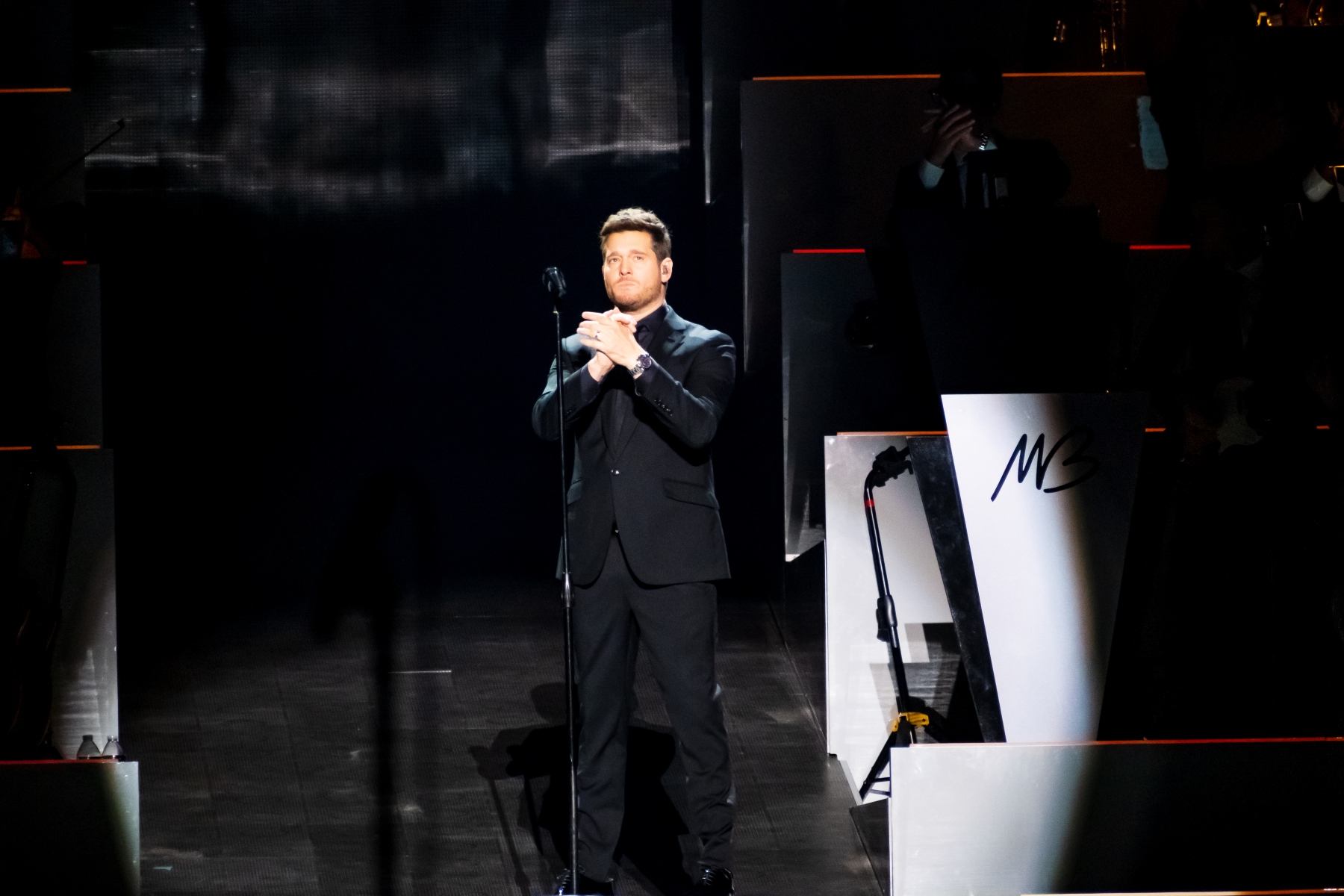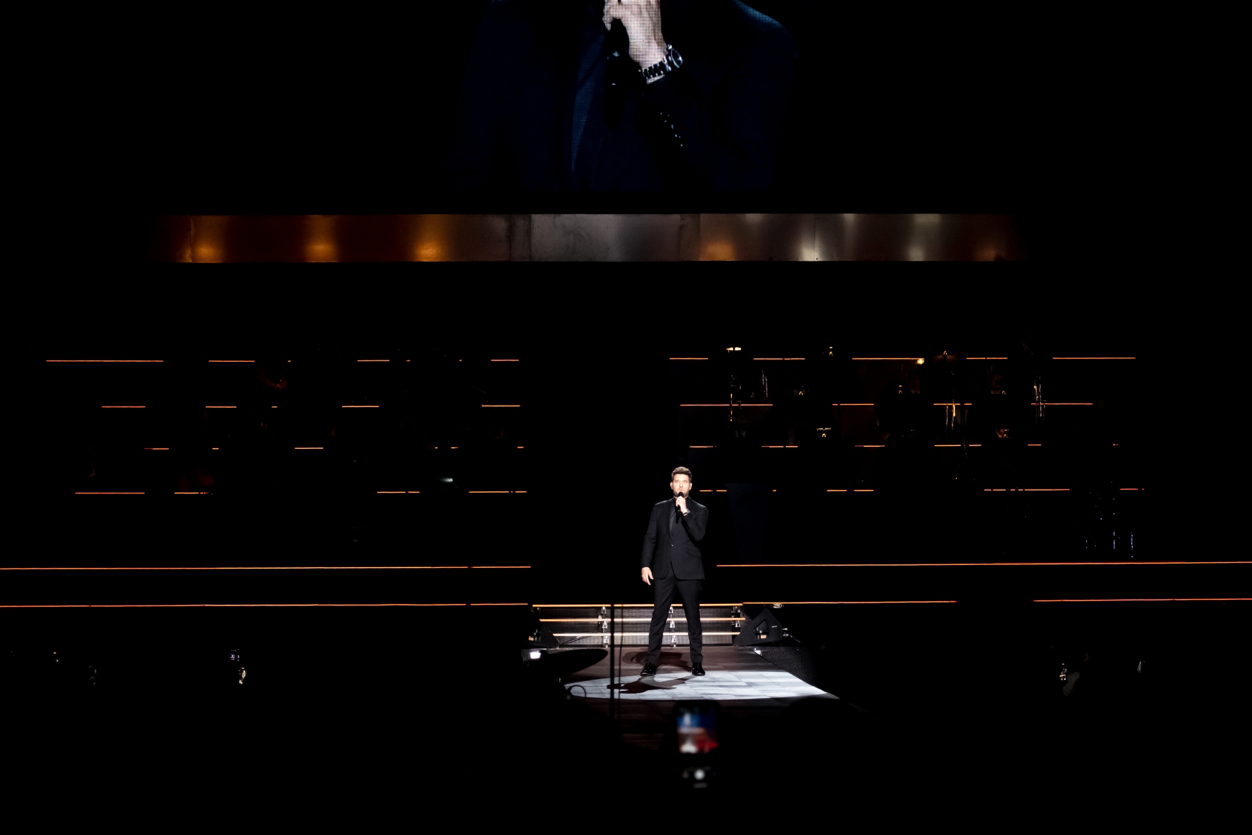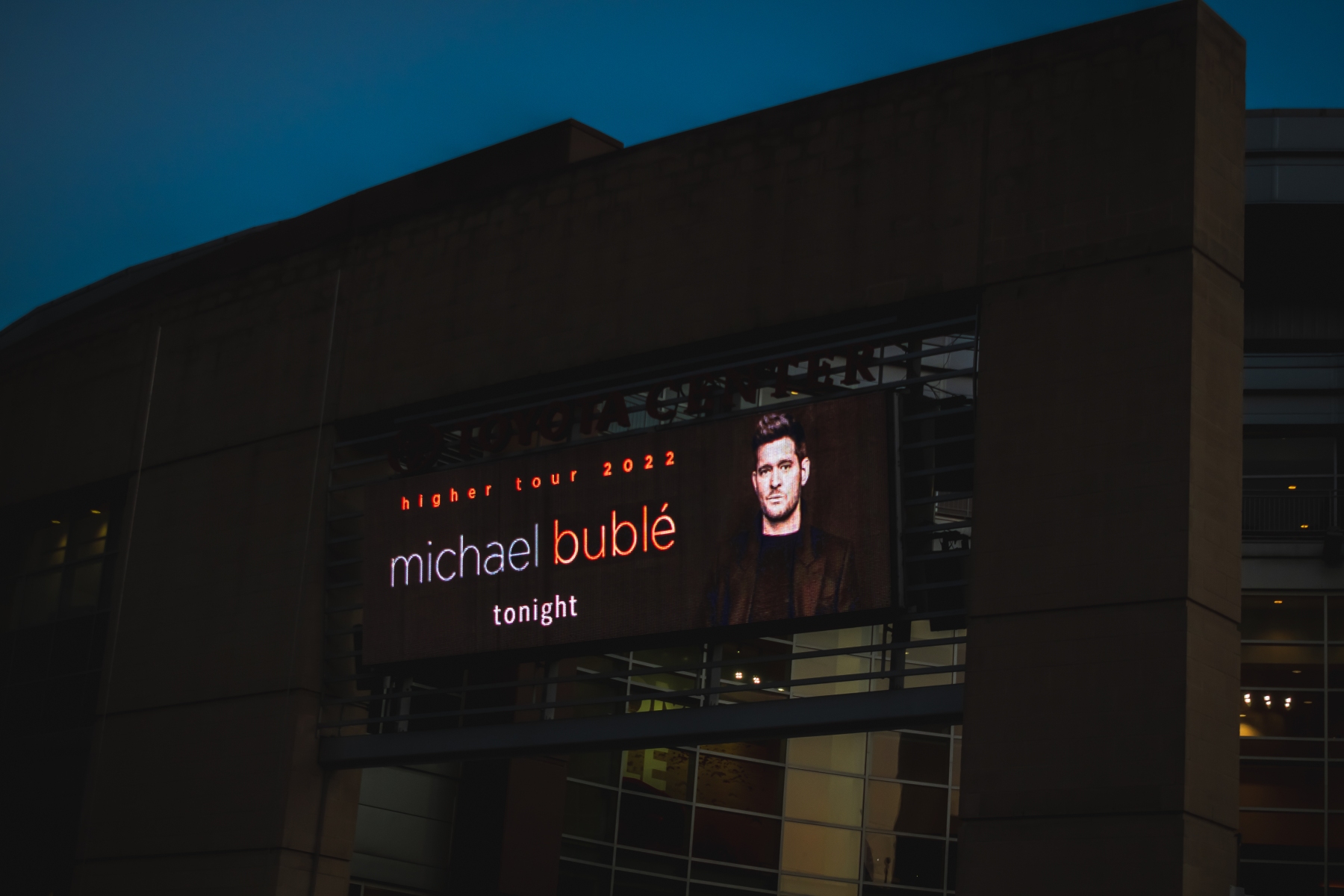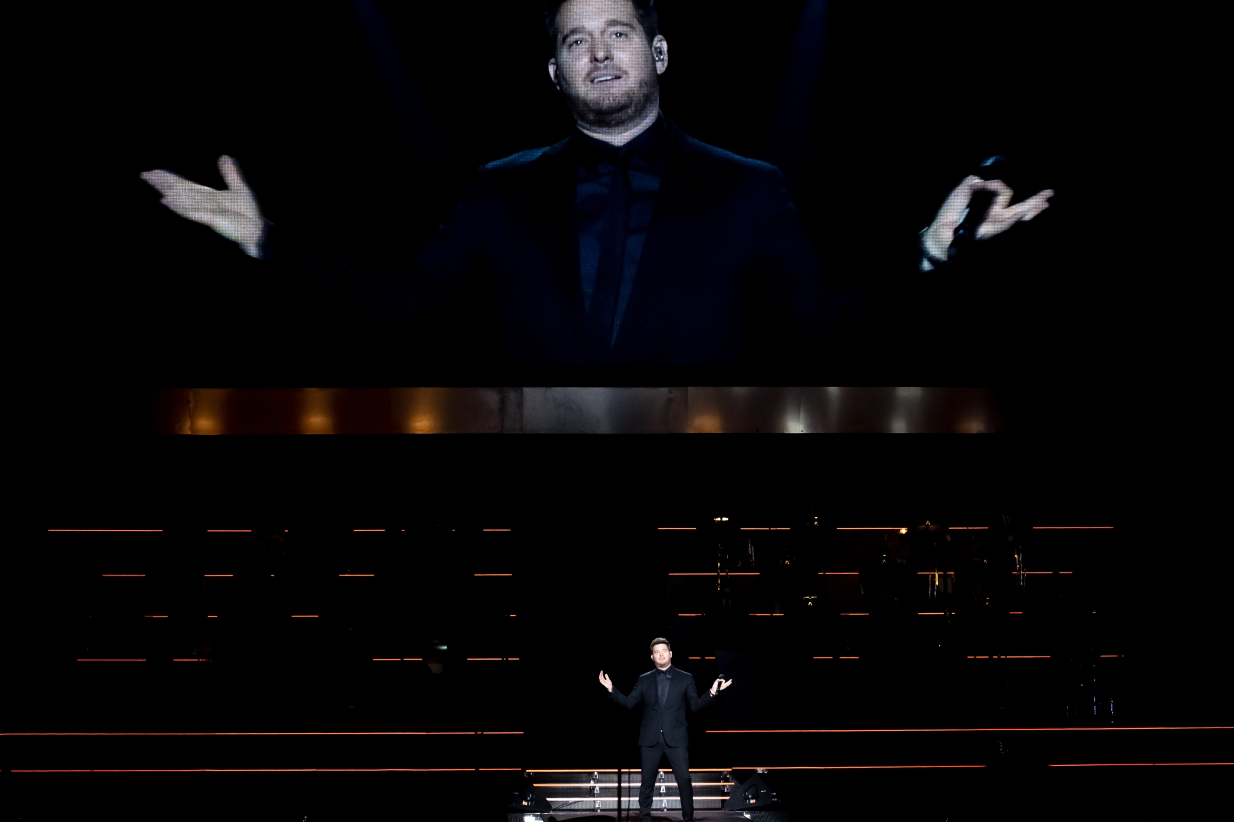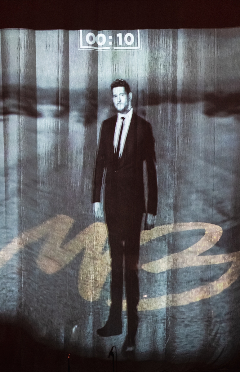Michael Bublé made his appearance in Houston, performing for his Higher Tour Series of 2022, on September 13th. The multi-platinum singer and GRAMMY Award-Winning Artist filled the Toyota Center. The Concert started with a graphic that had the initials of Michael Bublé written on a picture of a curtain. The images started to change into a visual that showed a picture of him with a clock counting down until the show began. When the countdown was completed the stage went pitch dark and the visuals on the screen started changing into a flame that changed the color of Michael Bublé’s initials into a golden burnt orange. Atmospheric mist filled the stage with a spotlight that pointed directly on Bublé and the performance began.