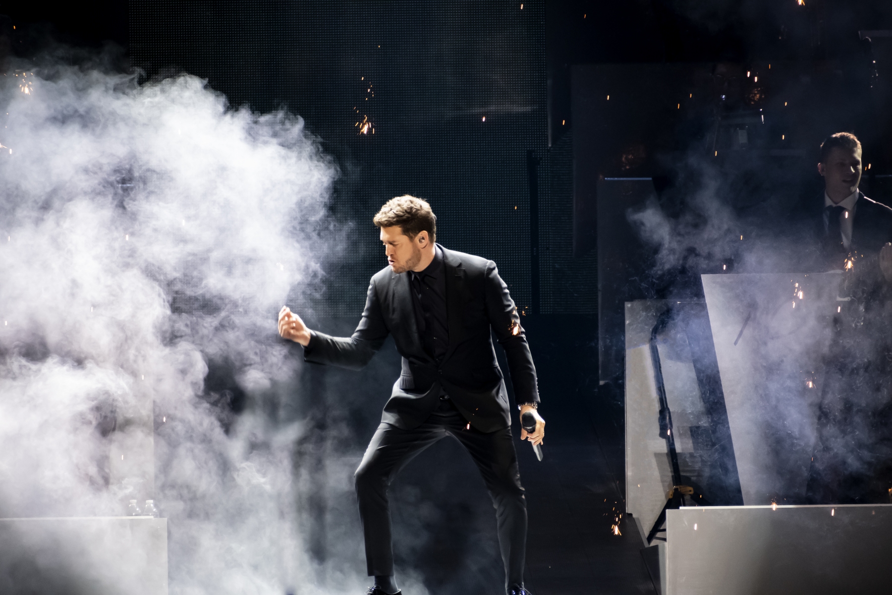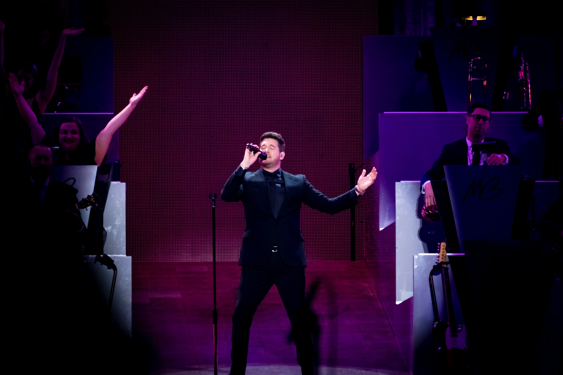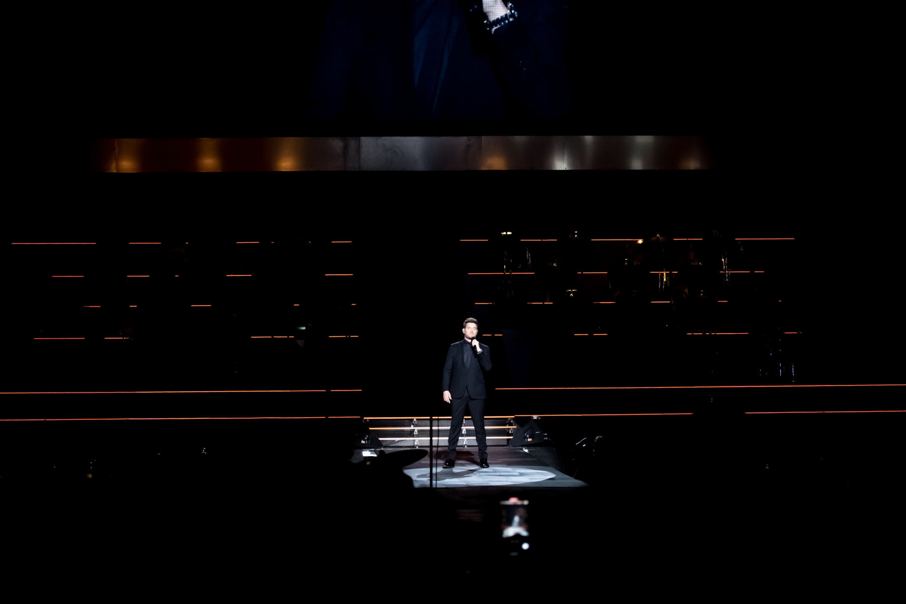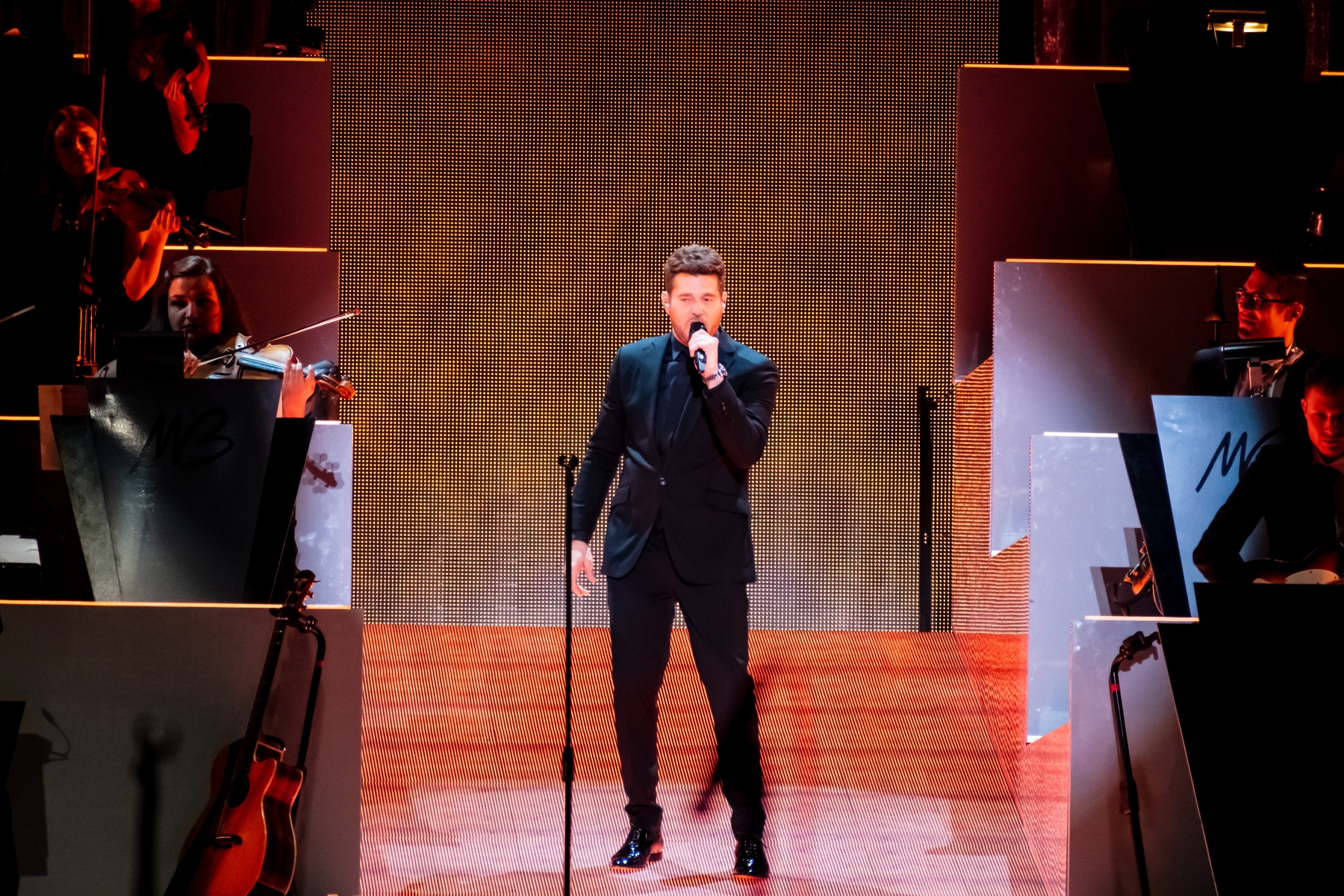 Michael Bublé made his appearance in Houston, performing for his Higher Tour Series of 2022, on September 13th. The multi-platinum singer and GRAMMY Award-Winning Artist filled the Toyota Center. The Concert started with a graphic that had the initials of Michael Bublé written on a picture of a curtain. The images started to change into a visual that showed a picture of him with a clock counting down until the show began. When the countdown was completed the stage went pitch dark and the visuals on the screen started changing into a flame that changed the color of Michael Bublé’s initials into a golden burnt orange. Atmospheric mist filled the stage with a spotlight that pointed directly on Bublé and the performance began.