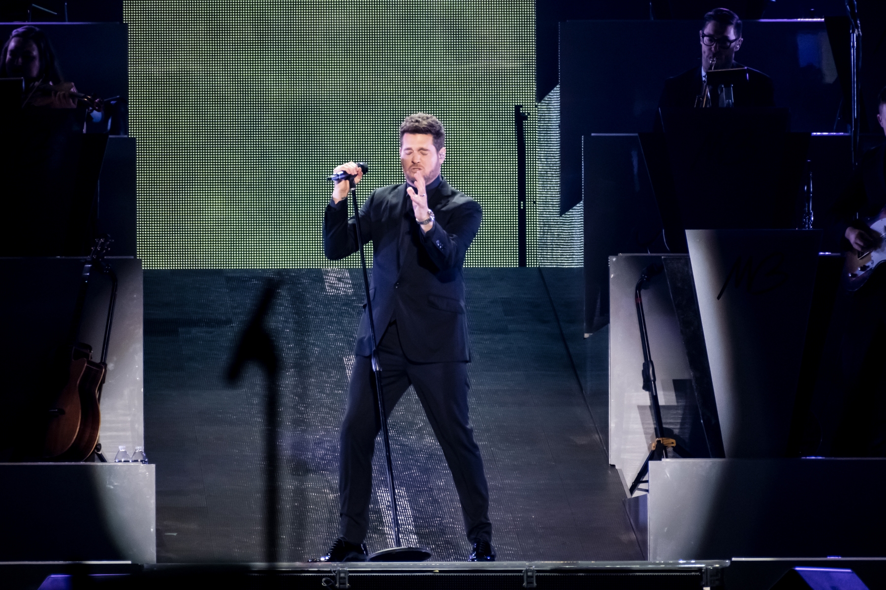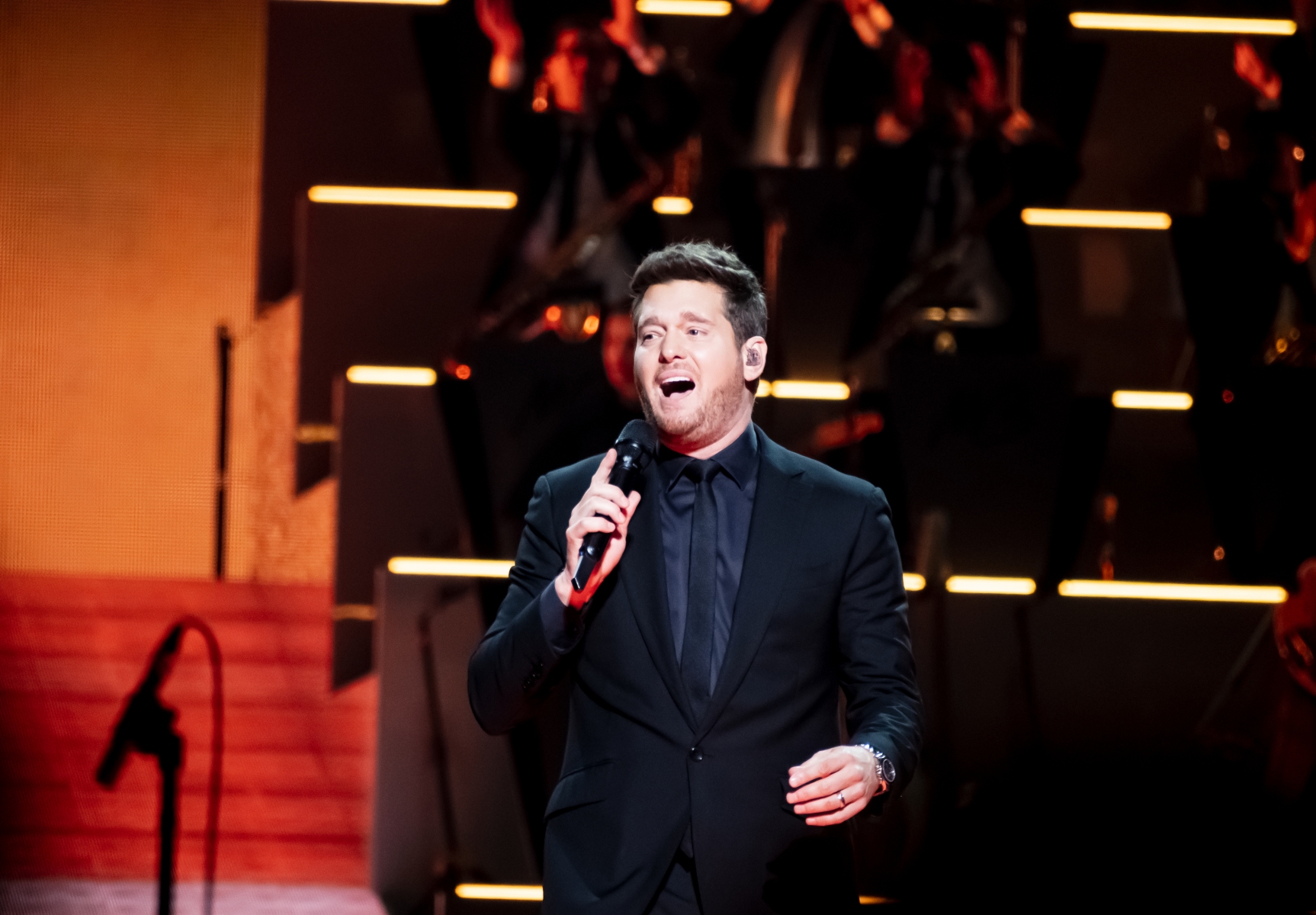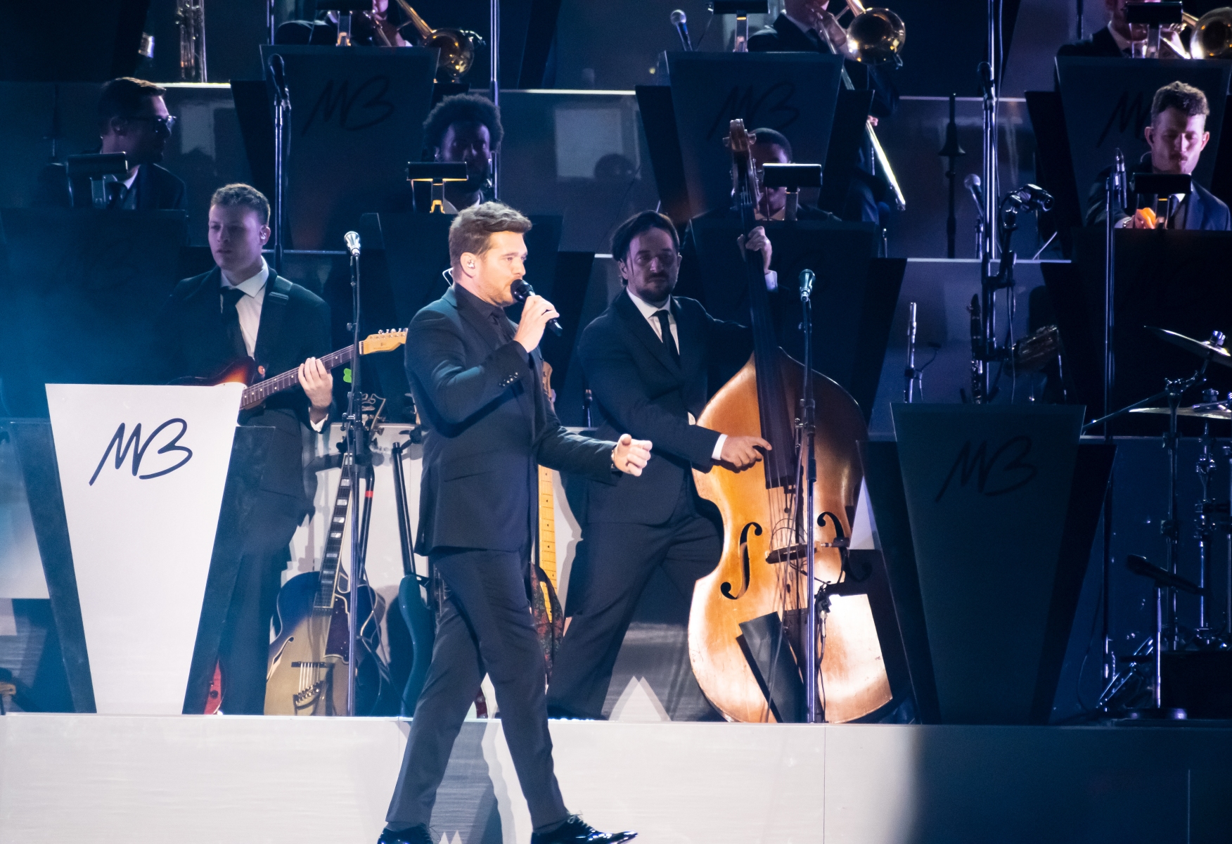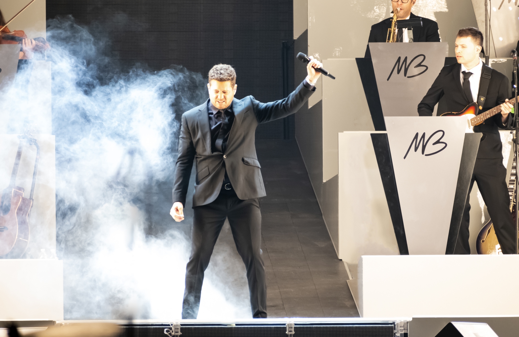 Michael Bublé made his appearance in Houston, performing for his Higher Tour Series of 2022, on September 13th. The multi-platinum singer and GRAMMY Award-Winning Artist filled the Toyota Center. The Concert started with a graphic that had the initials of Michael Bublé written on a picture of a curtain. The images started to change into a visual that showed a picture of him with a clock counting down until the show began. When the countdown was completed the stage went pitch dark and the visuals on the screen started changing into a flame that changed the color of Michael Bublé’s initials into a golden burnt orange. Atmospheric mist filled the stage with a spotlight that pointed directly on Bublé and the performance began.