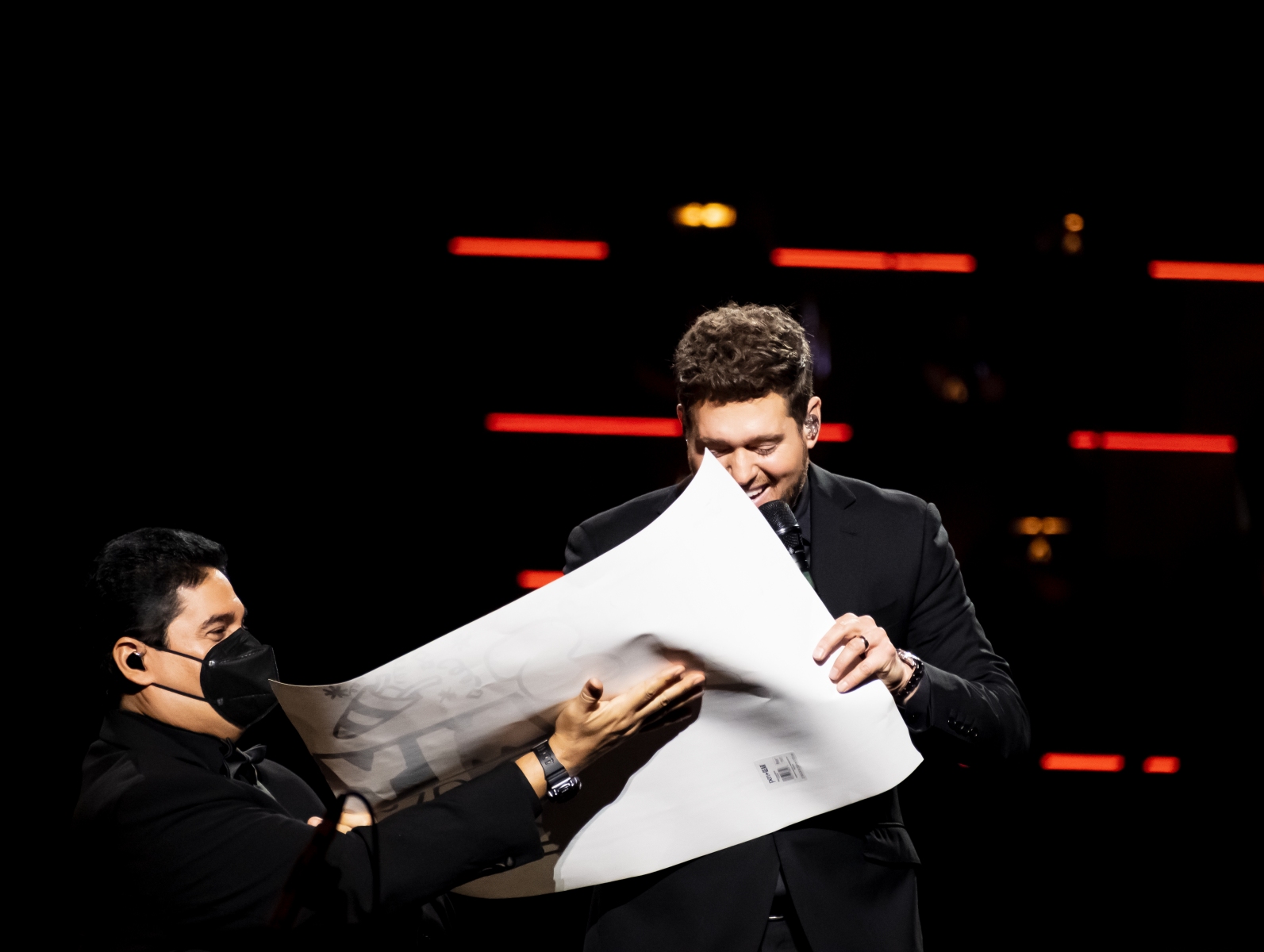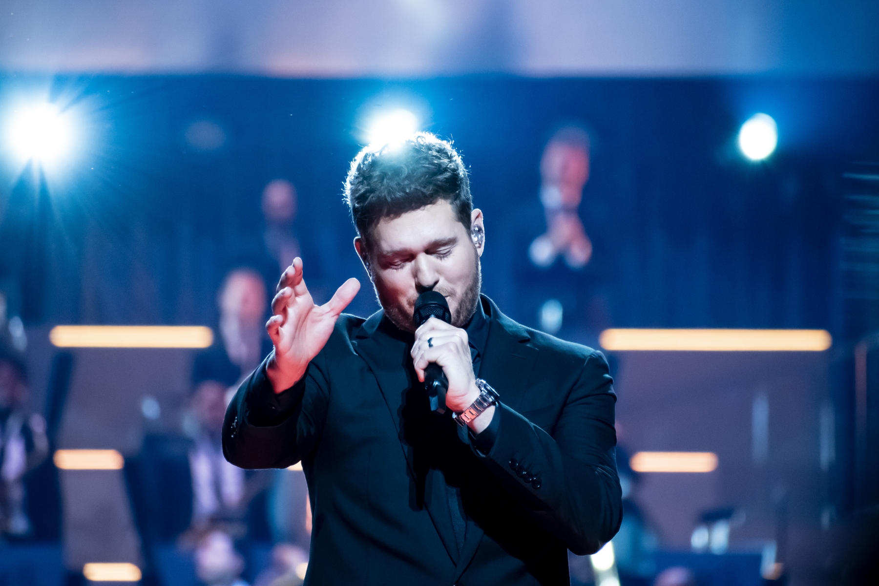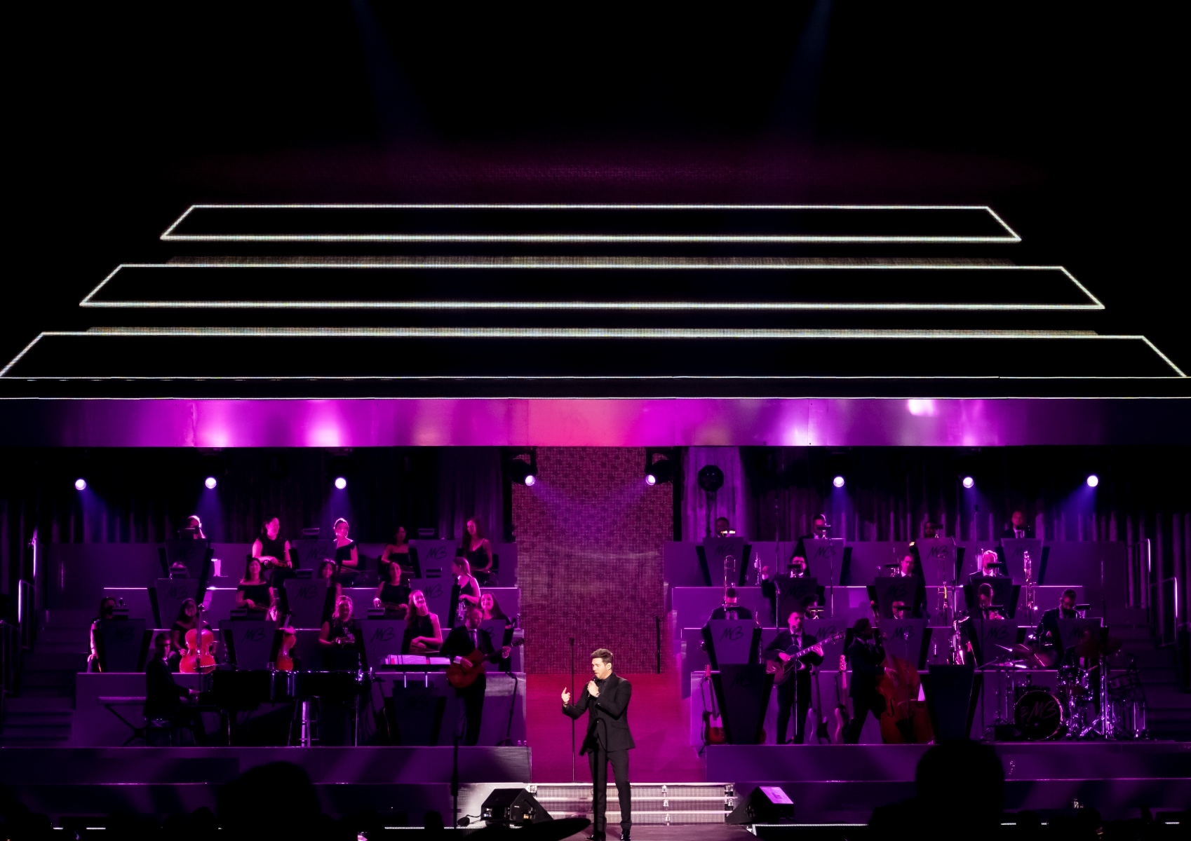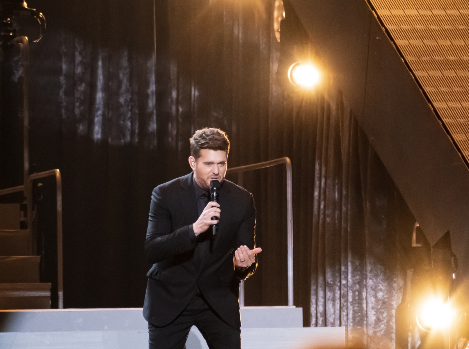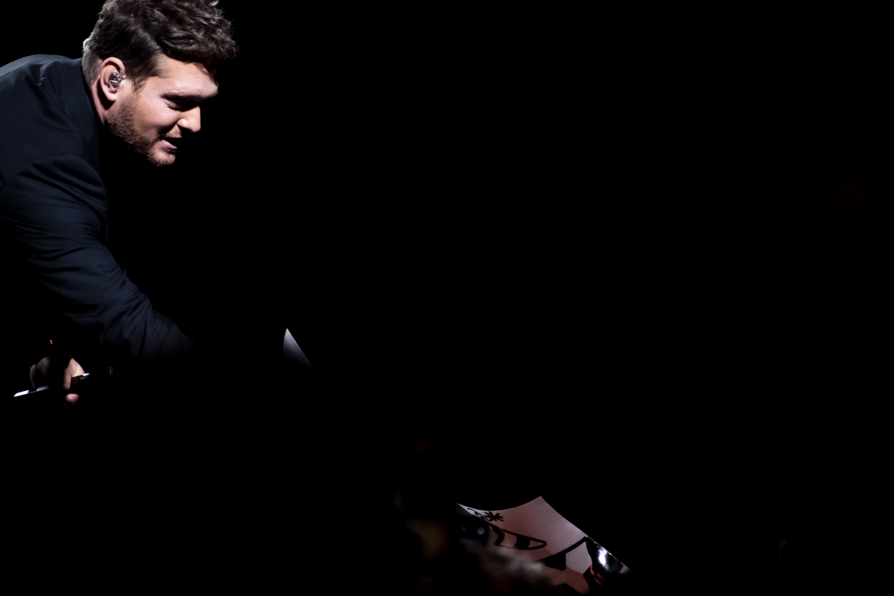 Michael Bublé made his appearance in Houston, performing for his Higher Tour Series of 2022, on September 13th. The multi-platinum singer and GRAMMY Award-Winning Artist filled the Toyota Center. The Concert started with a graphic that had the initials of Michael Bublé written on a picture of a curtain. The images started to change into a visual that showed a picture of him with a clock counting down until the show began. When the countdown was completed the stage went pitch dark and the visuals on the screen started changing into a flame that changed the color of Michael Bublé’s initials into a golden burnt orange. Atmospheric mist filled the stage with a spotlight that pointed directly on Bublé and the performance began.