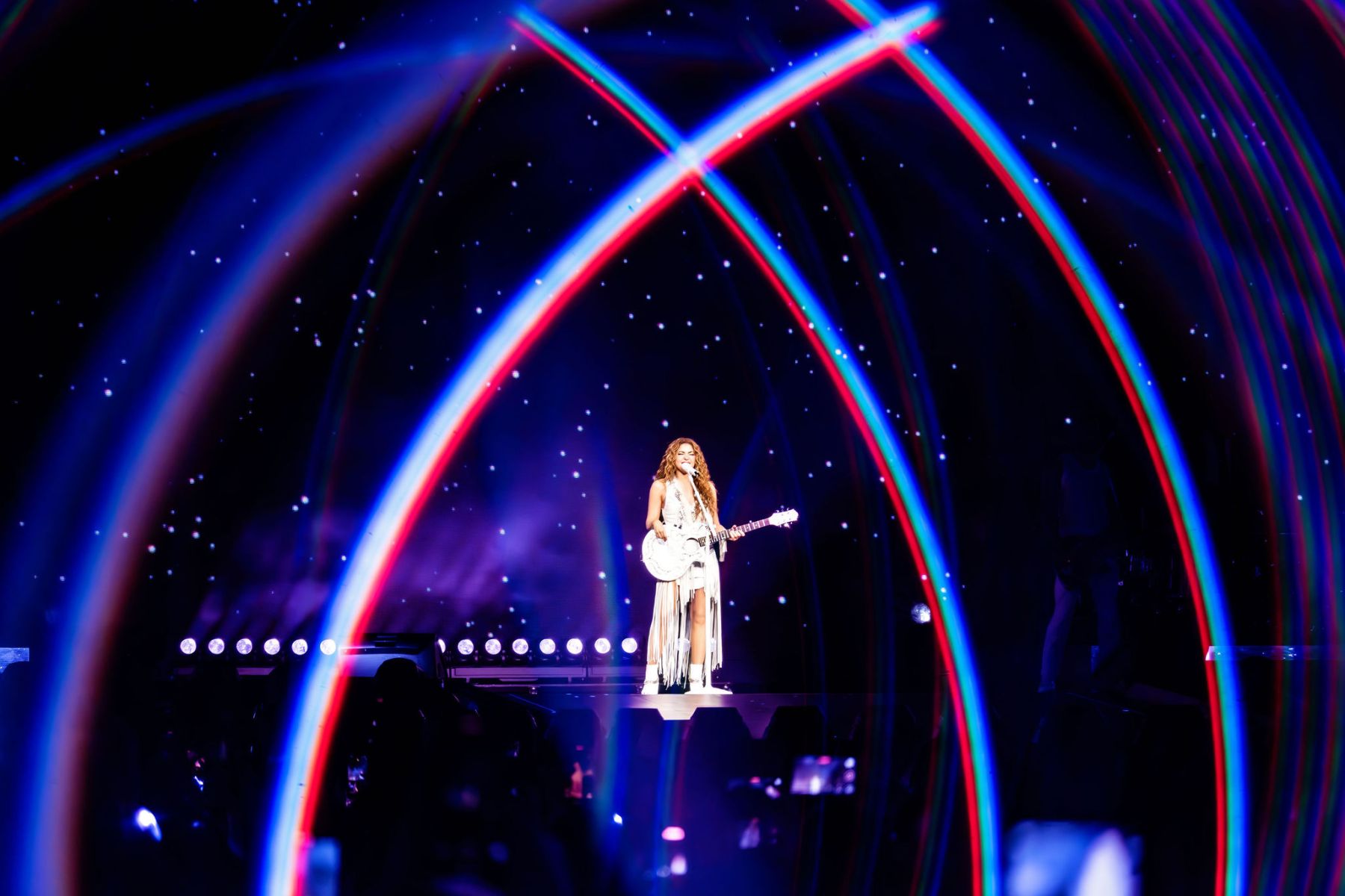 when confetti fell all over the stadium. Shakira started with “La Fuerte” with explosive energy as