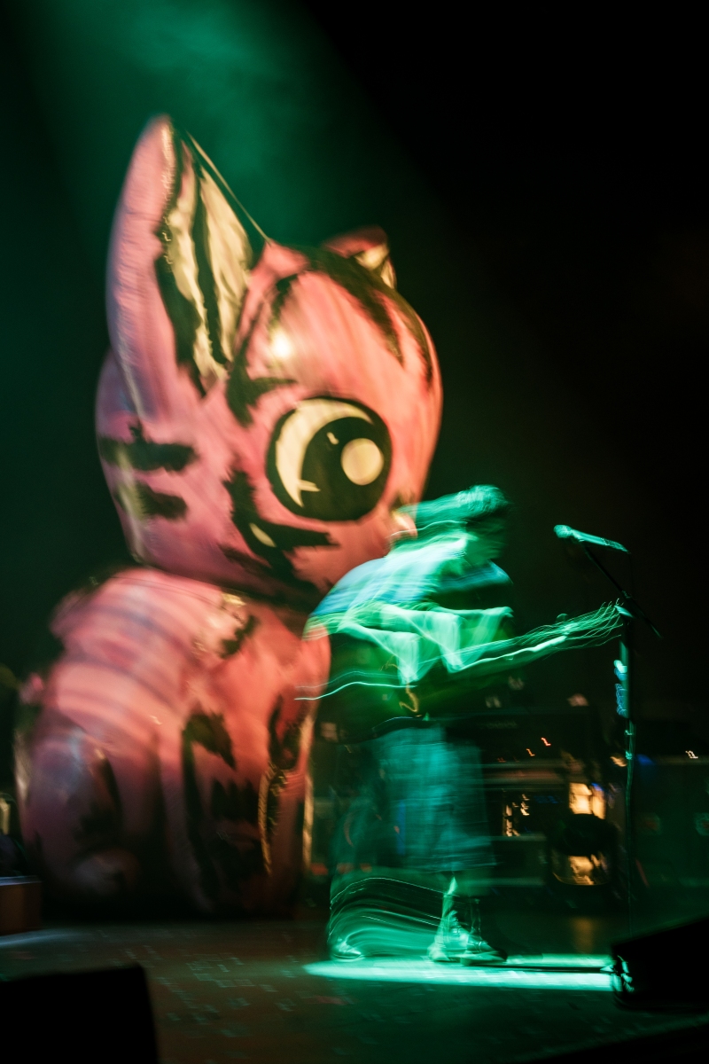 The first thing I’d like to mention is the stage setup. After ericdoa’s set, the crew brought out a gigantic inflatable cat. The crowd made so many comments about the cat, but the funniest was when an audience member shouted, “I would die for you, smile cat!” The set design was impressive, featuring a giant billboard with another screen behind it displaying a cityscape. It felt immersive, and the visuals were perfectly paired with each song. Many of the visuals highlighted song lyrics pulled from Google searches, fan posts, and articles about Porter Robinson, and even displayed the chords playing at that exact moment. Some visuals early in the night had a nostalgic, mid-2000s YouTube lyric video vibe, making me both giggle and reminisce. Seeing glittery, Myspace-esque text on a giant billboard next to an inflatable cat was a surreal moment. I love singalongs, so having the lyrics on screen made it easier to join in—though it’s probably the reason I lost my voice afterward.