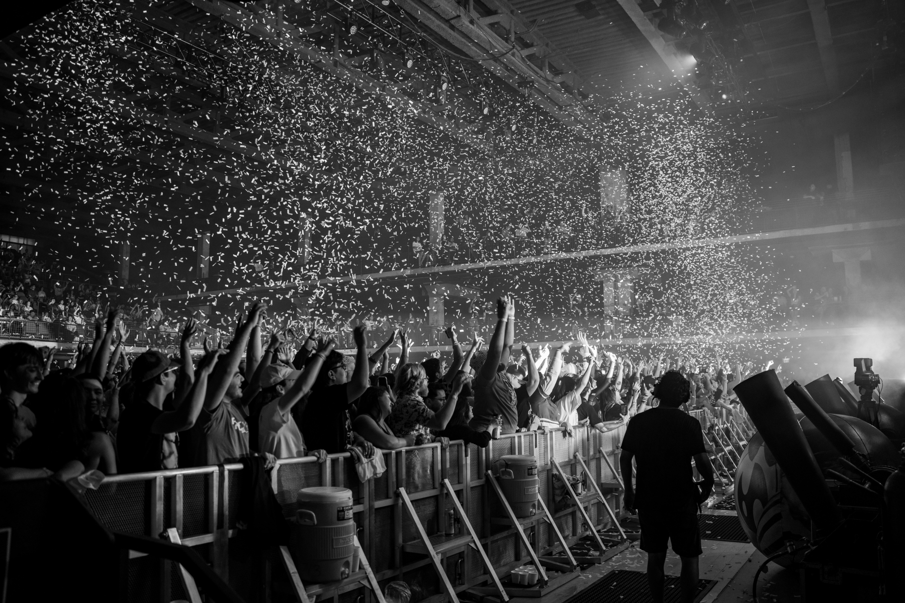 The setlist was also very interesting. Not only did he play nearly every song from his newest album, Smile! 😀 (nine in the first part and one during the encore), but he also included songs from his earlier eras. He kicked off the night with tracks from Smile! 😀, and the first prop we saw was during the song “Year of the Cup,” where he brought out a giant blue solo cup. Audience members jokingly asked, “What’s in the cup?” several times, and at one point, while drinking from a smaller blue cup, he responded, “I could be drinking prune juice; you just got fooled! None of your goddamn business what’s in the cup!” Another fun moment was when huge inflatable balls featuring the Smile! 😀 album cover were tossed into the crowd. My favorite part of this section was when they covered “Kids” by MGMT. Porter asked the audience not to record it because he believed the song would be more fun with everyone off their phones—and he was absolutely right. Watching the crowd dance, including myself, was so much fun, and everyone respected his request. There was also an unreal amount of confetti. One of the most memorable moments came towards the end of this section, with heart-shaped red confetti falling during a beat drop. I’d never seen confetti in that shape before, so I took some home—it was so cute, and I loved it.