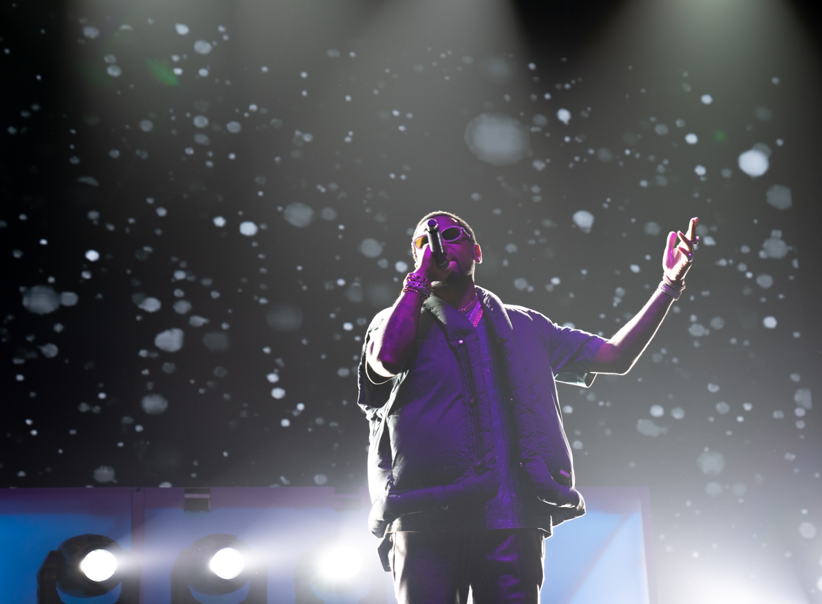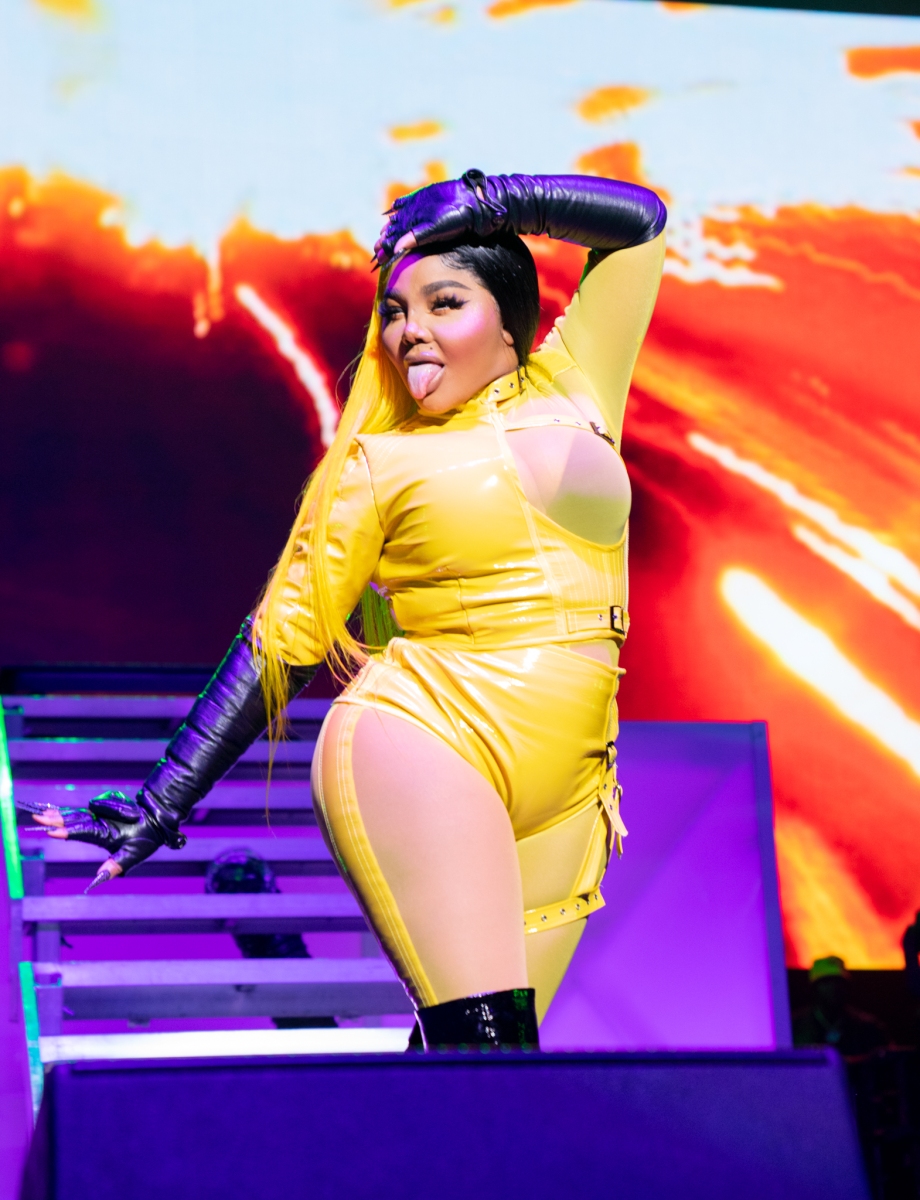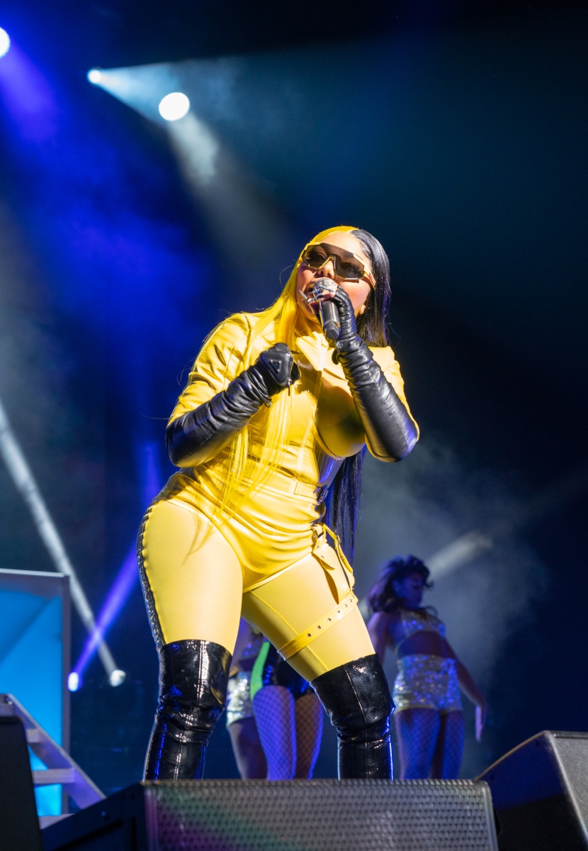 After some intentional feedback, Lil Kim came up. Literally out of a giant box the Queen Bee, dressed in yellow and black, made her way down a flight of stairs onto the stage with 20 to 25 acrobatic dancers. The Magic Stick rapper, has enough stage presence to lock in on her performance and not blend in with the well choreographed revue.